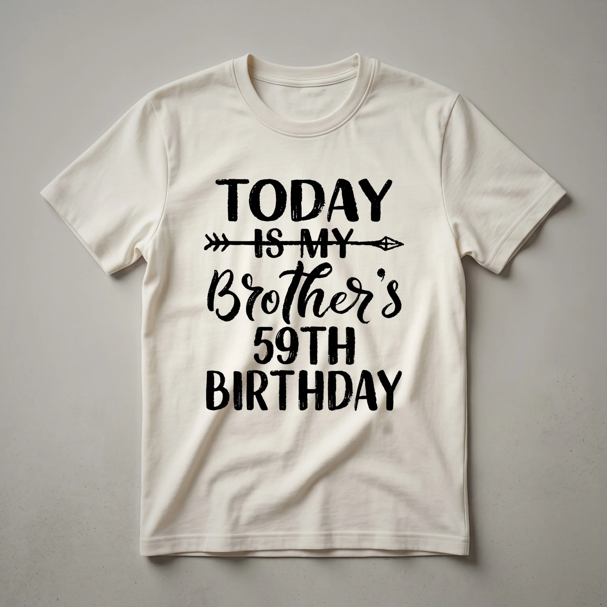 Brothers turning 59 deserve a special celebration, and this graphic t-shirt is a fantastic way to mark the milestone. The design features bold white lettering that clearly states 'Today Is My Brother's 59th Birthday,' making it an immediate conversation starter at any party. This shirt is a thoughtful gift for any sibling who is proud to be celebrating their 59th year. It's a staple in the collection for anyone looking to add a touch of humor and personal flair to their birthday attire. Imagine him wearing this tee to his birthday dinner or gathering, bringing smiles to everyone present. This comfortable shirt is a wearable memento of a significant birthday. It's a go-to tee for the brother who appreciates a straightforward and celebratory message. This apparel makes a thoughtful gift for your brother, ensuring he feels celebrated on his special day. Wear it to his birthday party for a unified celebratory look.