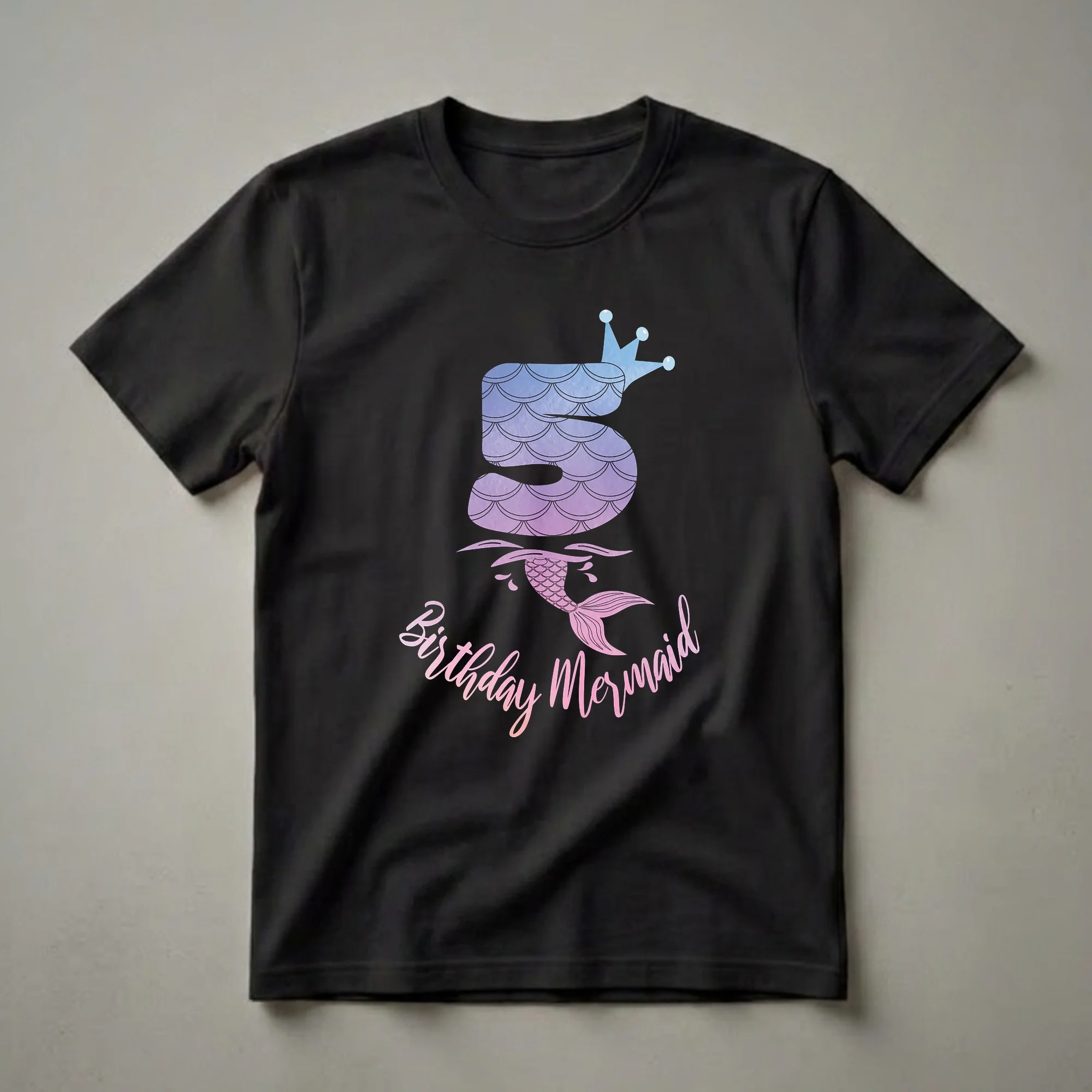 Five-year-old girls who dream of underwater adventures will adore this 'Birthday Mermaid' t-shirt. The design prominently features a large, stylized number '5' adorned with a shimmering mermaid crown, complete with playful blue and purple watercolor tones. Below the number, a whimsical mermaid tail, rendered in soft pinks and purples, emerges from gentle waves, splashing with a few droplets. The phrase 'Birthday Mermaid' is elegantly scripted in a gradient of pink and orange hues, encircling the tail. This eye-catching graphic tee is a wonderful way for a child to celebrate her special day, making her feel like a magical creature from the sea. It's a thoughtful gift for any young girl turning five who loves mermaids, fantasy, and celebrating in style. This t-shirt works well for birthday parties, family gatherings, or just for everyday wear when she wants to showcase her love for all things mermaid. Imagine her delight when she unwraps this unique birthday apparel, ready to make a splash on her big day. This shirt is a staple for any mermaid-themed celebration.