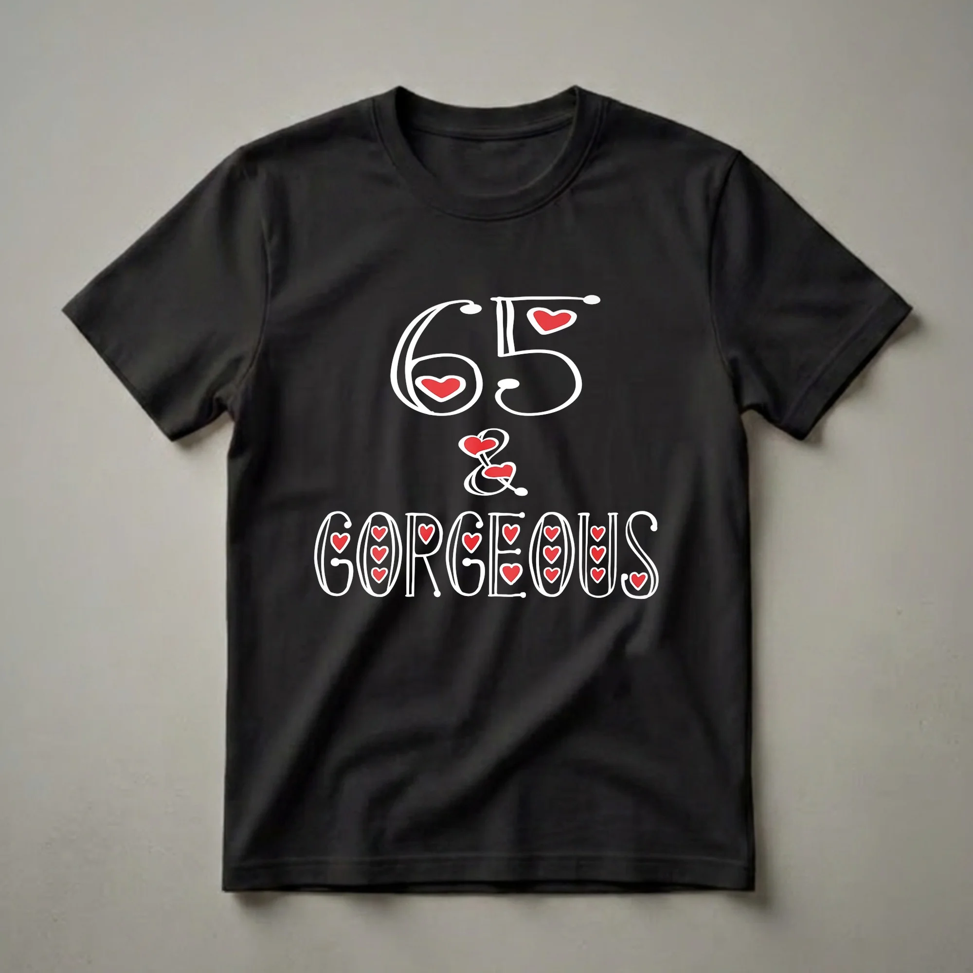 Turning 65 is a significant milestone, marking six and a half decades of life, wisdom, and experiences. This "65 and Gorgeous" graphic tee is designed to celebrate women who embrace this special birthday with style and confidence. The design features bold, stylized white lettering that spells out "65 & GORGEOUS," accented with vibrant red hearts. The number 65 is prominently displayed at the top, followed by the ampersand, and then the word "GORGEOUS" in a larger, more decorative font. Each letter in "GORGEOUS" is adorned with small red hearts, adding a touch of flair and festivity. This t-shirt is a thoughtful gift for any woman celebrating her 65th birthday, whether it's for a birthday party, a family gathering, or just as a special surprise. It’s a comfortable and eye-catching piece of apparel that she can wear to show off her celebratory spirit. This shirt is a go-to tee for birthday brunches or casual get-togethers, making her feel celebrated and fabulous on her big day. It's a wonderful way to acknowledge this important birthday and remind her that 65 is indeed gorgeous.