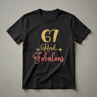 Sixty-seven years young and feeling absolutely fabulous! This eye-catching graphic tee is suited for women celebrating their 67th birthday. The design features a bold '67' in shimmering gold glitter, accented with small red hearts and dots, followed by the phrase 'And Fabulous' written in elegant coral script, outlined in gold glitter. An arrow graphic with a heart detail pierces through the word 'And', adding a touch of playful charm. This t-shirt is a wonderful way for any woman to express her joy and confidence as she reaches this significant milestone. It makes a thoughtful gift for a wife, mother, or friend who is embracing her 67th year with flair. Imagine her wearing this comfortable shirt to her birthday brunch, a family gathering, or a casual outing with friends, radiating her fabulous spirit. This shirt is a staple for any birthday celebration, ensuring she feels special and celebrated on her big day. It's more than just apparel; it's a statement of confidence and joy for the woman who is 67 and truly fabulous.