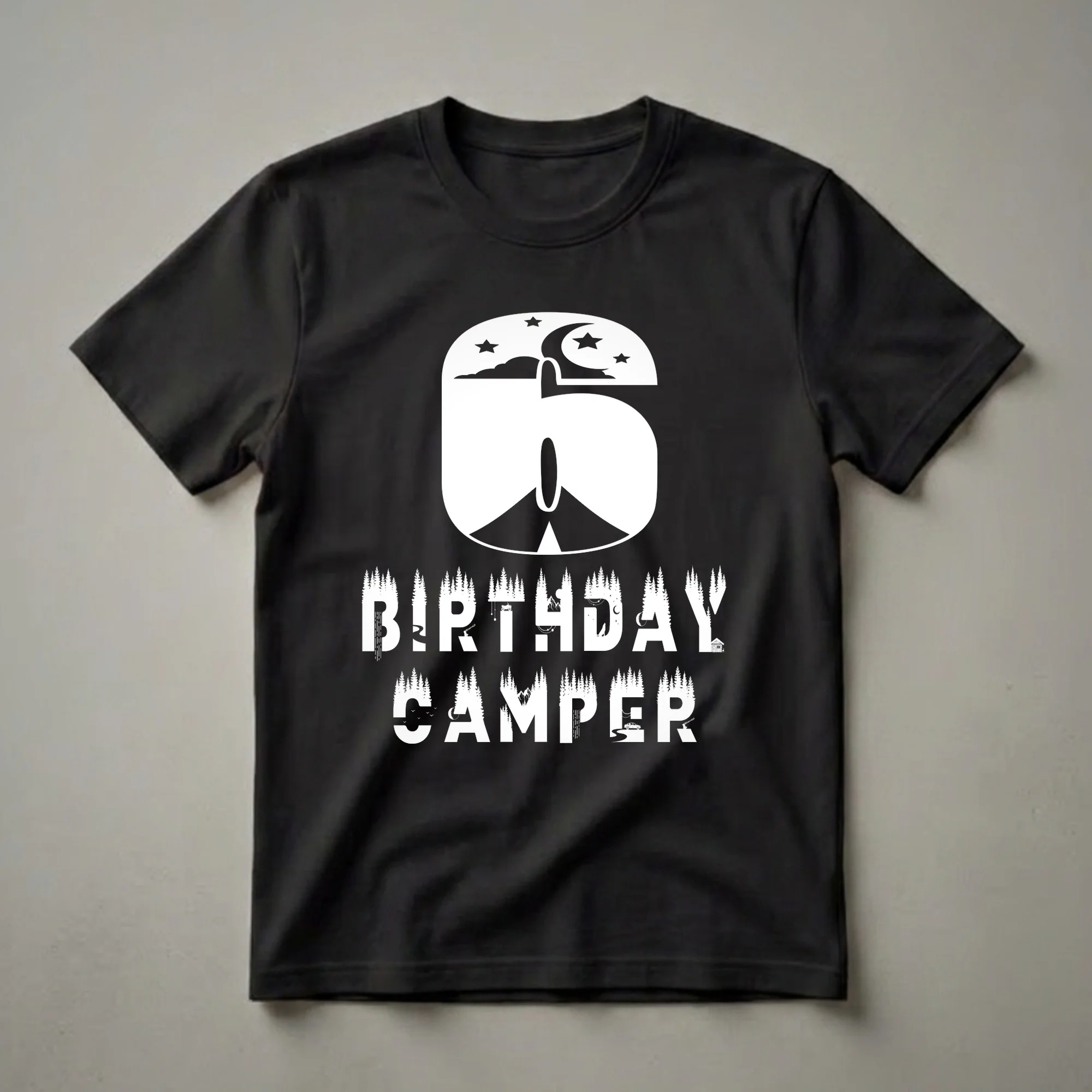 Six-year-olds celebrating their birthday will love this "Birthday Camper" t-shirt. The design prominently features a large white number 6, filled with a night sky scene complete with a crescent moon, stars, and clouds over a tent. Below the number, the words "BIRTHDAY CAMPER" are displayed in bold white lettering, with each letter creatively incorporating elements of a forest and camping. The "B" has a waterfall, the "R" has an axe, the "T" has an ATV, the "D" has mountains and a moon, the "Y" has a small cabin, the "C" has birds flying, the "M" has mountains, and the "R" has an axe. This graphic tee is a fantastic way for a child turning six to express their love for camping and outdoor exploration. It makes a thoughtful gift for any young adventurer on their special day, great to wear to a birthday party or a family camping trip. This shirt is a fun way to commemorate turning six and embracing the spirit of adventure.