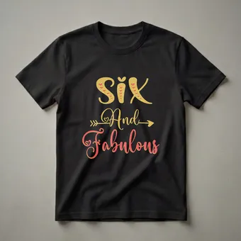 Six-year-old girls are entering a new phase of childhood, full of imagination and growing independence. This 'Six and Fabulous' birthday tee captures that celebratory spirit. The word 'SIX' is rendered in a shimmering gold glitter texture, adorned with small red hearts, symbolizing love and excitement for this milestone age. Below it, 'And' is presented in a similar gold glitter font, framed by a golden arrow on each side, suggesting forward momentum and adventure. The word 'Fabulous' is written in a vibrant coral glitter script, outlined in gold, adding a touch of glamour and flair. This t-shirt is a wonderful way for a daughter to express her excitement on her special day. It makes a thoughtful gift for any girl turning six, whether for a birthday party, a family gathering, or just to wear as she celebrates becoming six. This shirt is a go-to tee for any birthday girl who wants to feel special and celebrated. Imagine her delight wearing this eye-catching shirt to her birthday brunch or party, making her feel like the star of the celebration.