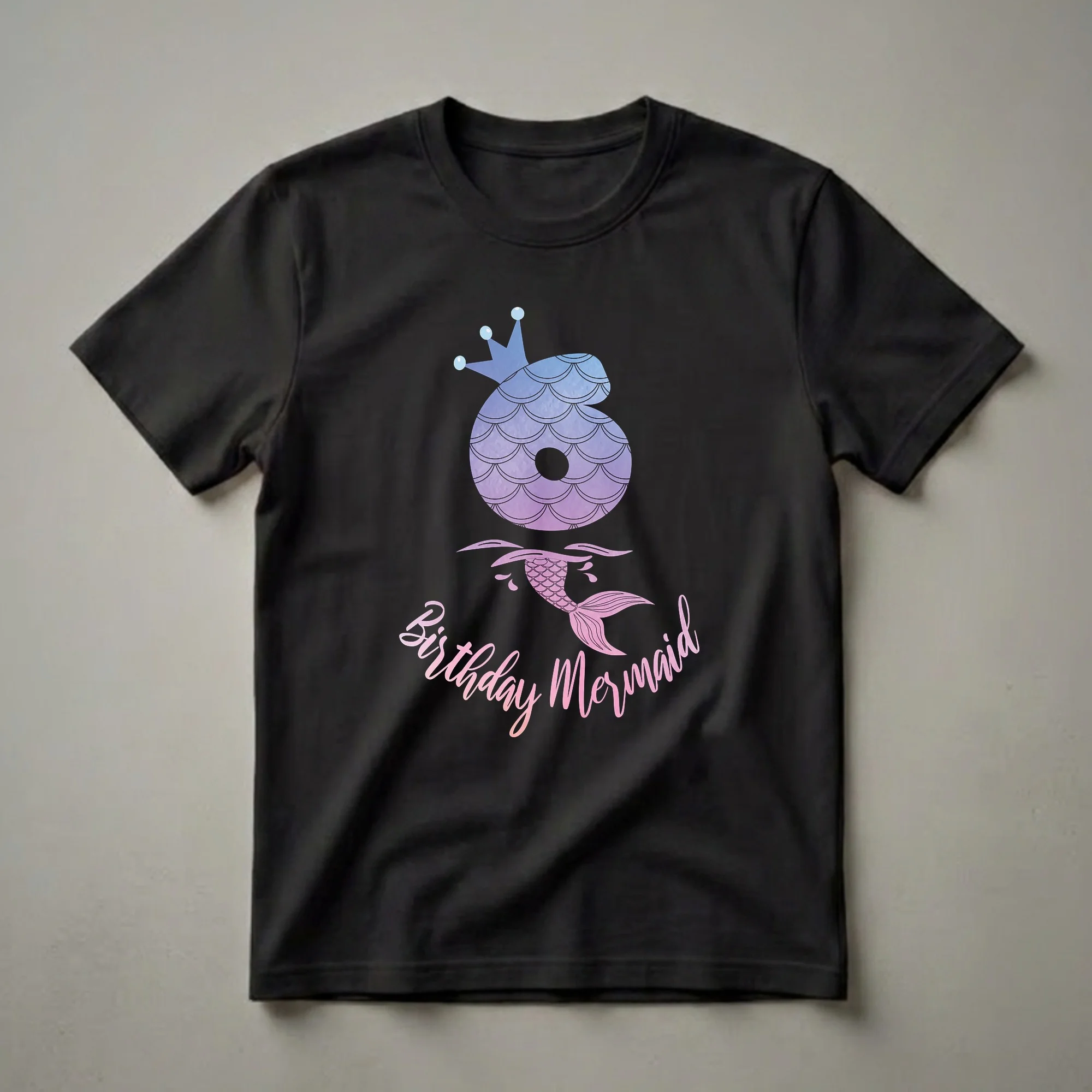 Six-year-old girls who dream of underwater kingdoms will adore this magical mermaid birthday tee. The graphic showcases a vibrant watercolor-style number 6, adorned with a playful crown featuring light blue pom-poms. Below the number, a shimmering mermaid tail emerges from stylized waves, complete with detailed scales in shades of pink and purple. The phrase "Birthday Mermaid" is elegantly scripted beneath, adding a whimsical touch. This t-shirt is a thoughtful gift for any young girl turning six, celebrating a milestone age where imagination and fantasy play are at their peak. It's a wonderful way for her to express her love for mermaids and make her special day even more memorable. She will reach for this shirt to wear to her birthday party, to school, or on any day she wants to feel like royalty under the sea. The design captures the wonder and excitement of turning six, making it a cherished keepsake for any little mermaid enthusiast. This shirt is a staple for any birthday celebration.