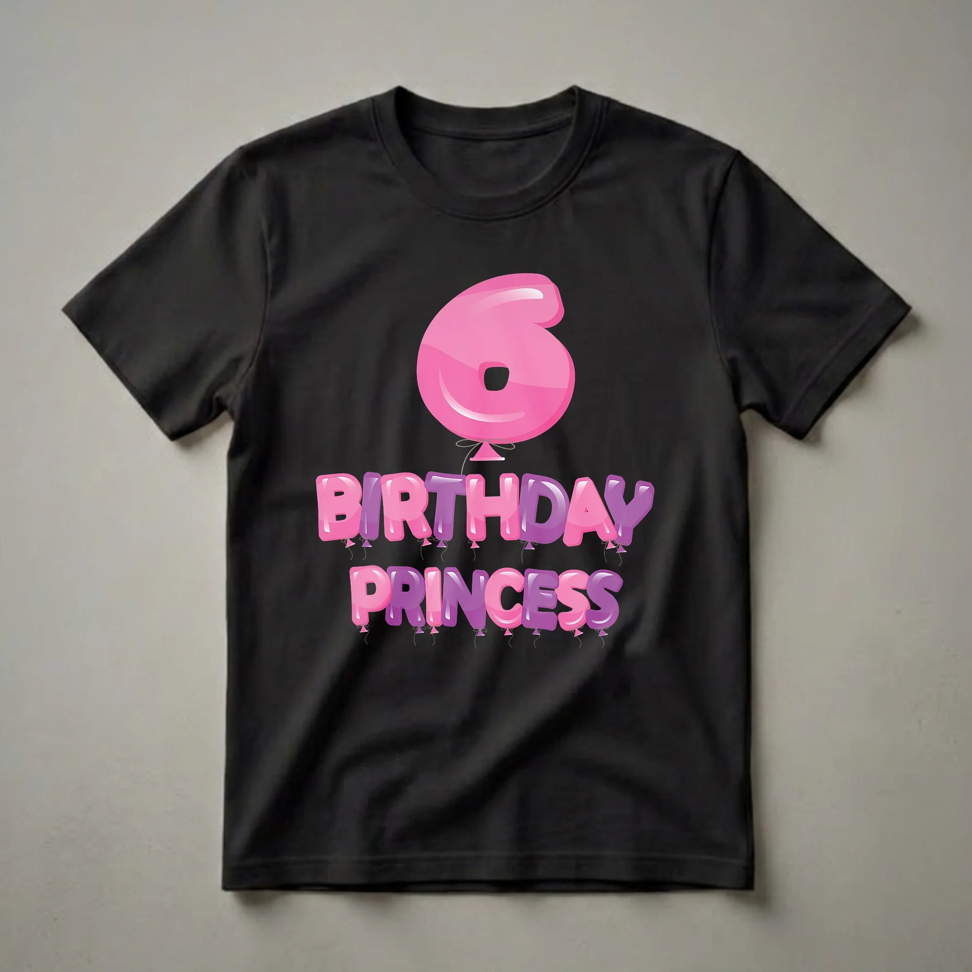 Six-year-old girls who love all things royal will adore this festive birthday tee. The design features a large, glossy pink balloon shaped like the number 6, floating above the words "BIRTHDAY PRINCESS." The text itself is rendered in a playful, balloon-like font, alternating between vibrant pink and regal purple, with each letter appearing to be inflated and tied with delicate strings and tiny party hats. This eye-catching graphic makes a statement for any little one celebrating a milestone birthday. Turning six is a significant age, marking a transition into early elementary school years, where imagination and play are paramount. This shirt is a thoughtful gift for any 6-year-old princess, whether it's for her birthday party, a family gathering, or just a special treat. She will reach for this t-shirt to wear to her birthday brunch or to show off her special day. It's a wonderful way to make her feel like the queen of her own celebration, adding a touch of magic to her big day.