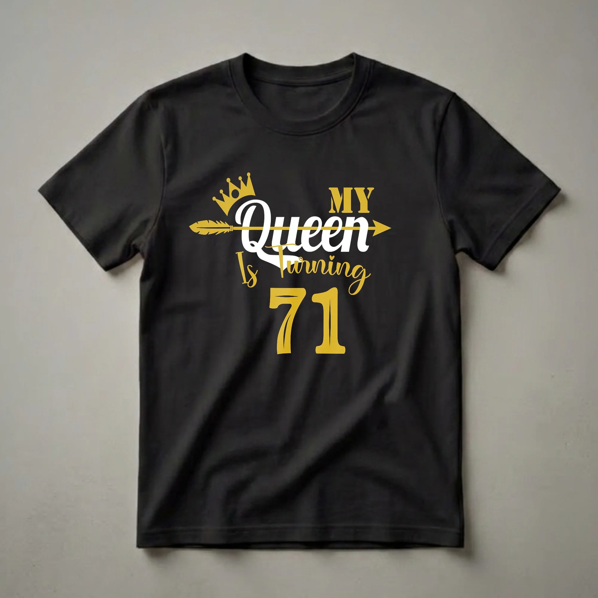 Women celebrating their 71st birthday deserve to feel like royalty, and this 'My Queen Is Turning 71' t-shirt delivers just that. The design features a regal gold crown atop the word 'Queen' in elegant white script, with a golden arrow piercing through it, symbolizing forward momentum. The phrase 'My Queen Is Turning' appears in a smaller gold script, leading to the prominent '71' in bold gold lettering. This graphic tee is a fantastic way for a mother, grandmother, or wife to commemorate her 71st year. Turning 71 marks a significant milestone, often a time for reflection and celebration of a life well-lived. This shirt makes a thoughtful gift for her birthday dinner, a family gathering, or a casual get-together with friends. She will reach for this comfortable tee to showcase her queenly status on her special day and beyond. It's a wearable declaration of her enduring grace and the joy of reaching this impressive age.