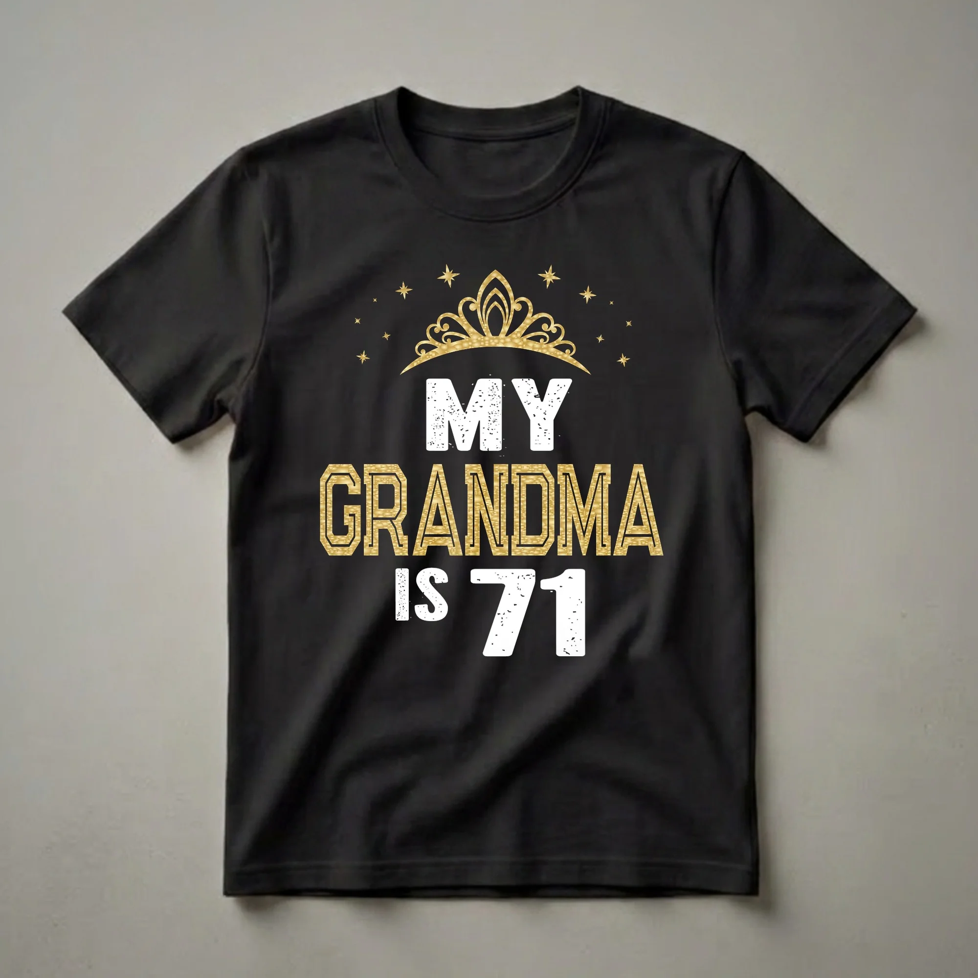 Grandmas turning 71 deserve to feel like royalty, and this striking graphic tee makes that statement loud and clear. The design features a regal golden crown adorned with sparkling stars, set against a classic black background. Bold, distressed white lettering announces "MY GRANDMA IS 71," with the word "GRANDMA" highlighted in a shimmering gold texture, emphasizing the milestone. This t-shirt is a fantastic way for grandchildren to show their love and appreciation for their Nanny on her 71st birthday. It’s a thoughtful gift idea that she can wear to her birthday party, a family brunch, or any celebration honoring her special day. The distressed font adds a touch of vintage flair, making this shirt a stylish choice for any grandmother who loves to celebrate her age with pride. This tee is a go-to for any grandchild looking for a unique and memorable present for their beloved Nanny. Imagine her delight when she unwraps this special birthday shirt, ready to wear her queen status with joy and confidence. It's more than just apparel; it's a wearable declaration of love and a celebration of reaching 71 years.