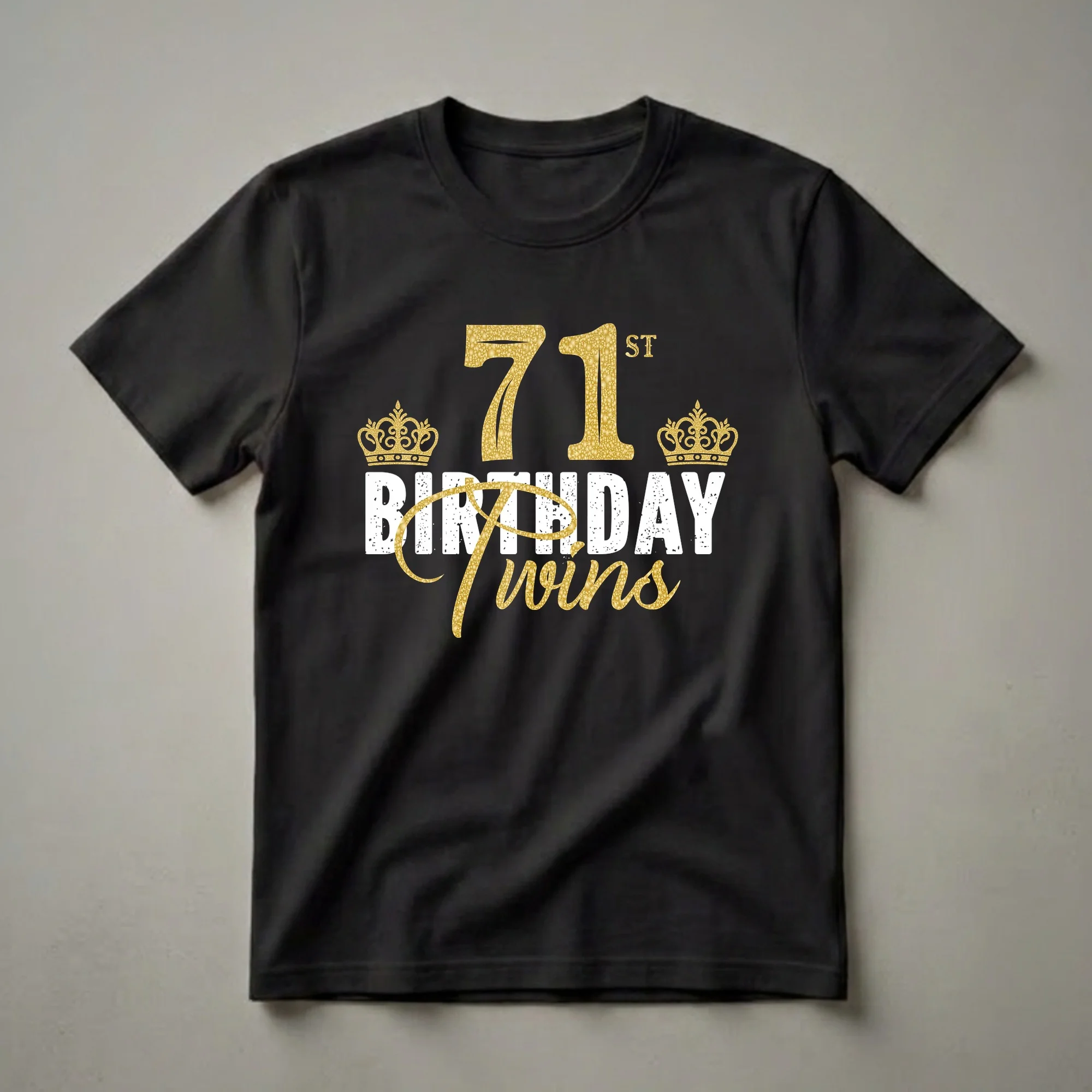 Twin brothers and sisters celebrating their 71st birthday will reach for this eye-catching graphic tee. The design prominently features the number '71' rendered in a textured gold fill, signifying the milestone age. Above the number, 'ST' appears in a complementary gold, while flanking the main text are two ornate gold crowns, adding a regal touch. The words 'BIRTHDAY TWINS' are presented in a bold, distressed white font, with the word 'Twins' also accented in the same shimmering gold texture. This shirt is a fantastic way for twin siblings to commemorate their shared 71 years. It makes a thoughtful gift for the twin brother or twin sister who appreciates a celebratory and stylish statement piece. Wear this t-shirt to a birthday brunch, family gathering, or any occasion marking this significant milestone. It’s a unique way to honor the special bond shared by twins as they enter their eighth decade, a time often associated with reflection and enjoying accumulated wisdom.
