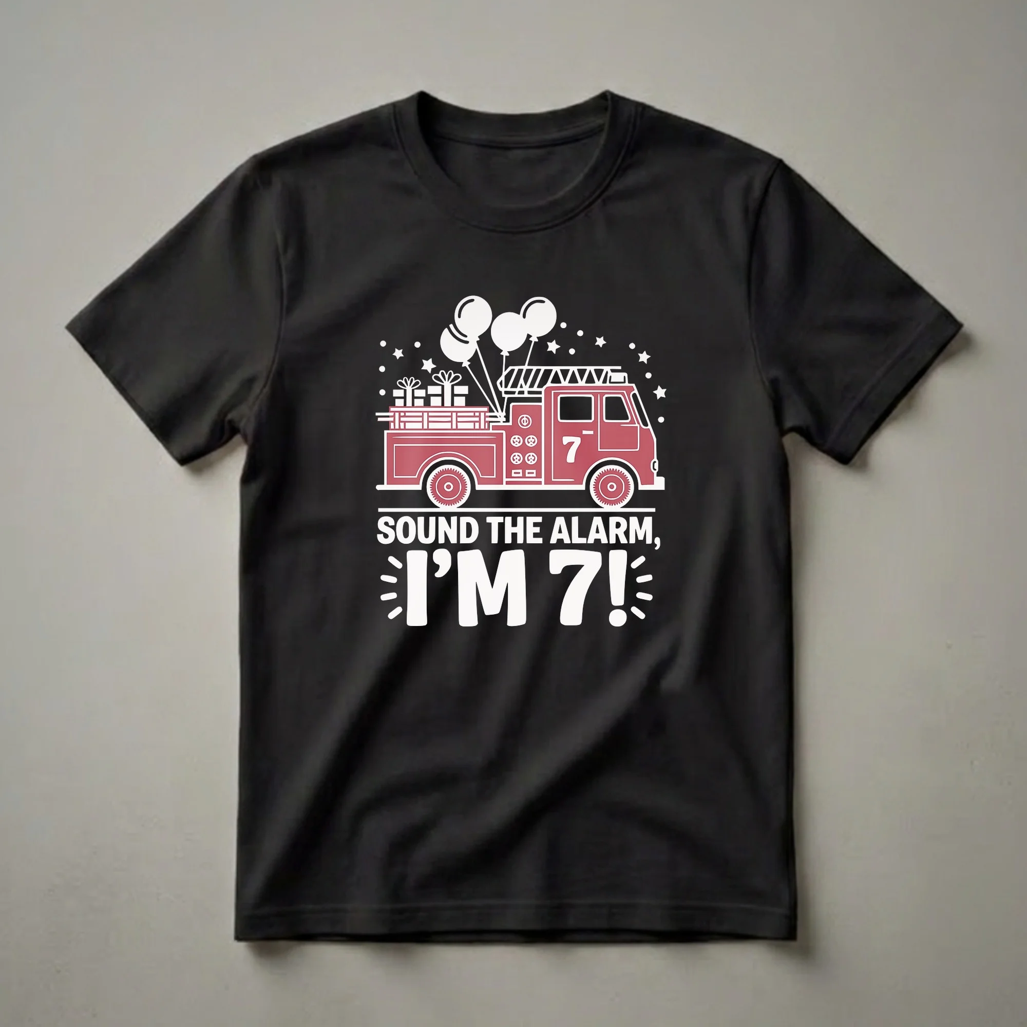 - This "Sound the Alarm, I'm 7!" firetruck graphic tee celebrates a child's seventh birthday with a rescue vehicle theme.
