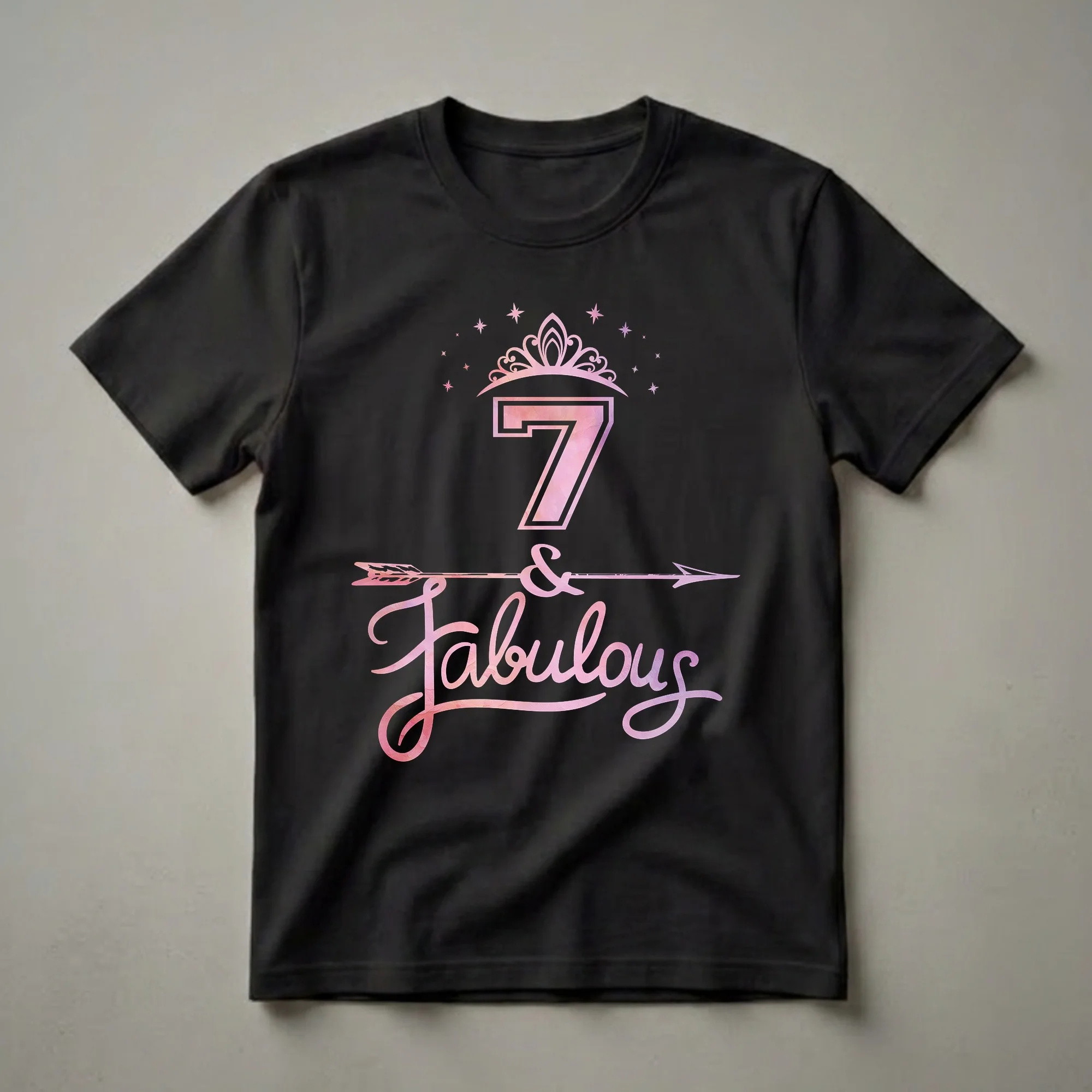 Seven-year-old girls are entering a vibrant stage of childhood, full of imagination and growing independence. This "7 & Fabulous" birthday t-shirt is designed to celebrate this milestone with flair. The graphic showcases a large, stylized number 7 filled with a pink and purple watercolor texture, topped with a sparkling tiara and surrounded by scattered stars. Below the number, a decorative arrow pierces through an ampersand, leading to the script word "Fabulous" in a matching watercolor style. This tee is a wonderful way for a girl turning seven to express her excitement for her special day. It makes a thoughtful gift for any 7-year-old girl from parents, grandparents, aunts, or friends who want to make her birthday celebration memorable. She will reach for this shirt to wear to her birthday party, family gatherings, or just to feel special on any given day. This comfortable shirt is a staple for any young girl's birthday wardrobe, celebrating her unique personality as she turns seven.