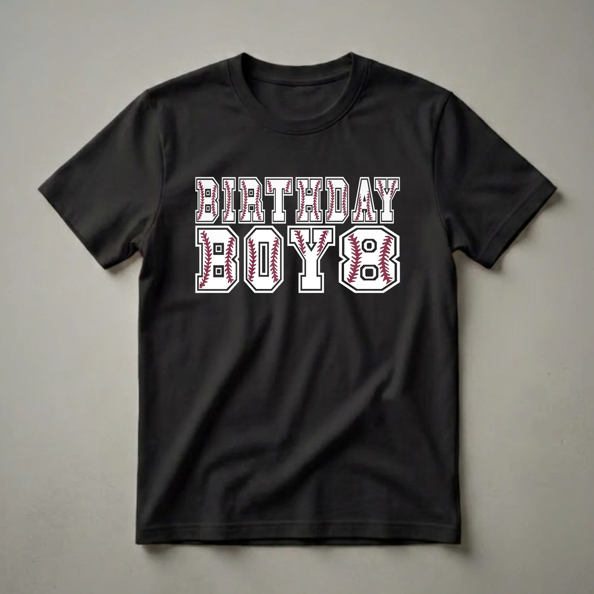 Eight-year-old boys who live and breathe baseball will love this eye-catching birthday tee. The design features bold, collegiate-style lettering in white with maroon baseball stitching and a black outline, spelling out 'BIRTHDAY BOY 8'. This graphic shirt is a fantastic way for any young slugger to celebrate turning eight. Baseball, a sport with a rich history dating back to the mid-19th century, is a beloved pastime for many children. This t-shirt captures the spirit of the game, making it a standout choice for a birthday party, a casual day out, or even to wear to a baseball game. Imagine the birthday boy proudly wearing this shirt as he opens gifts or celebrates with friends and family. It’s a thoughtful gift for any young athlete who dreams of hitting home runs and making the winning catch. This shirt is a staple for any 8-year-old's wardrobe during baseball season, offering comfort and style for their special day.