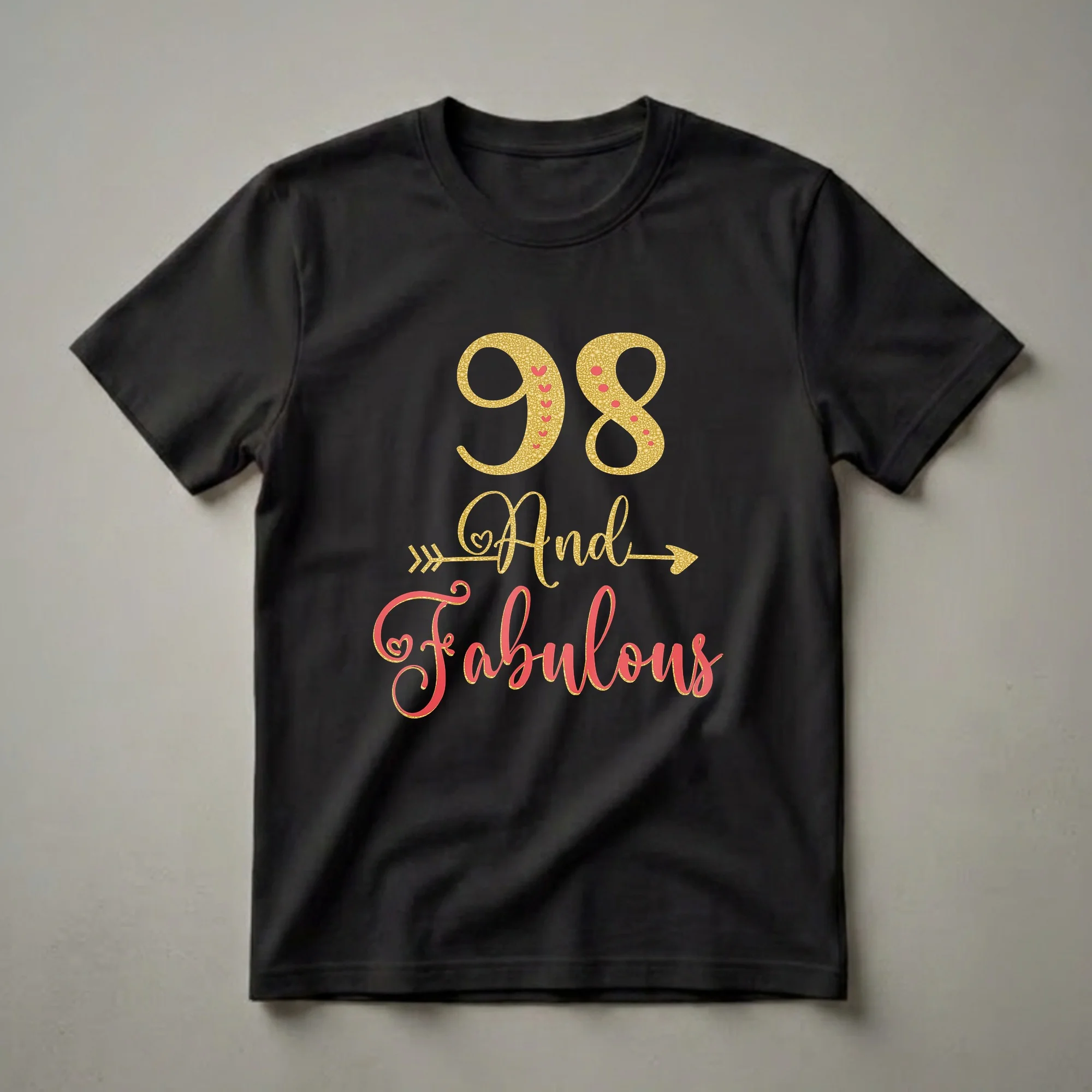 Grandmothers turning 98 deserve to celebrate in style, and this '98 And Fabulous' graphic tee is designed to do just that. The design features the number '98' in a shimmering gold glitter font, adorned with small red hearts and polka dots. Below it, the phrase 'And Fabulous' is written in an elegant, flowing script, also with a glitter effect, outlined in gold. An arrow graphic with a heart accent points towards the text, adding a playful touch. This shirt is a thoughtful gift for any woman reaching this incredible milestone, a thoughtful choice for her birthday party or a casual family gathering. It's a wonderful way for grandmas to showcase their enduring spirit and fabulousness as they celebrate nearly a century of life. This tee works well for the birthday honoree, making her feel special and cherished on her 98th birthday celebration. It’s a comfortable and stylish choice for any grandmother who loves to feel celebrated and look her best.