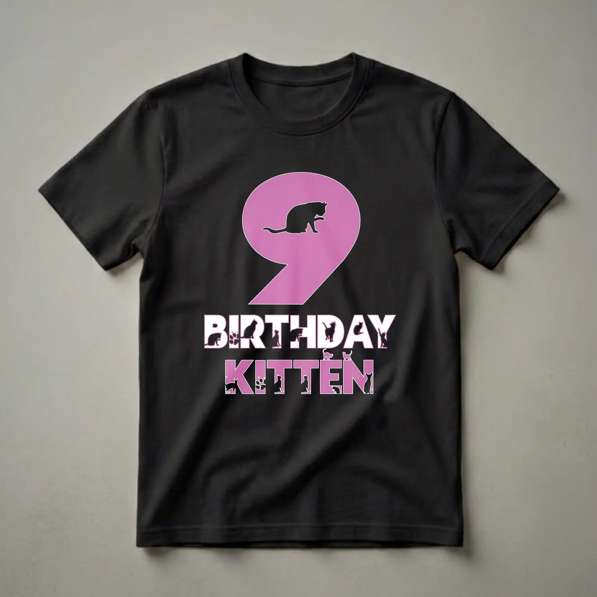Nine-year-old girls who adore felines will reach for this playful birthday tee. The design prominently features a large, stylized pink number '9' with a black cat silhouette perched on top, as if surveying its domain. Below, the words 'BIRTHDAY KITTEN' are rendered in bold white letters, with each letter creatively incorporating smaller black cat silhouettes in various poses, some sitting, some stretching, and one even showing a paw print. The 'KITTEN' text is in a matching pink hue, also filled with more feline figures and paw prints, reinforcing the theme. This shirt is a thoughtful gift for any young girl celebrating her ninth birthday who dreams of having a kitten or already cherishes her feline companions. It's a fun way for her to express her love for cats on her special day, whether at a birthday party, a family gathering, or just a casual day out. The playful imagery and clear theme make this t-shirt a standout choice for a cat-loving nine-year-old.