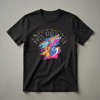 Nine-year-old violinists who are celebrating their special day will love this eye-catching graphic tee. The design features a classic orange violin with a bow, surrounded by a colorful abstract splash of pink, blue, and orange. Scattered around the artwork are musical notes in various bright colors, including a treble clef, eighth notes, and sixteenth notes, adding a playful musical theme. The text "THIS VIOLINIST IS 9" is prominently displayed in white, making it clear this shirt is for a birthday celebration. This t-shirt is a thoughtful gift for any child turning nine who is dedicated to learning and playing the violin. It's a fantastic way to acknowledge their musical journey and milestone birthday. Imagine them wearing this shirt to their birthday party or to their next music lesson, showcasing their passion for classical music. This apparel is a fun statement piece for any young performer eager to share their love for the violin with the world. It’s a staple for any young musician’s wardrobe, a go-to for casual wear or special occasions.
