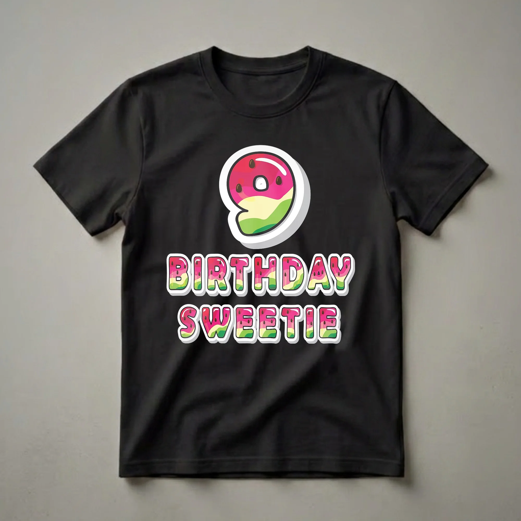 - This "Birthday Sweetie" graphic tee celebrates a nine-year-old girl's special day with a fun watermelon design.