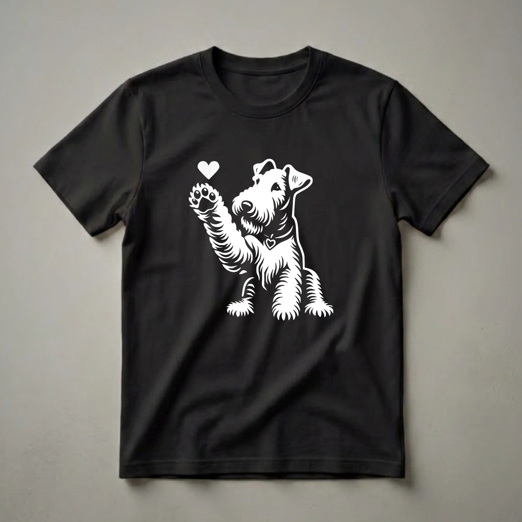 Airedale Terrier lovers who want to showcase their affection will reach for this striking graphic tee. The design features a white silhouette of an Airedale Terrier, a breed known for its distinctive wiry coat and energetic personality, sitting attentively. Its front paw is raised in a playful gesture, with a small white heart hovering just above it, symbolizing the deep bond between owners and their canine companions. Adding to the charm, the dog wears a collar with a small heart pendant. Airedale Terriers, originating from Yorkshire, England, were originally bred for hunting and later used as war dogs and police dogs, showcasing their versatility and intelligence. This shirt is a thoughtful gift for any Airedale mom or dad, or for someone who appreciates unique dog-themed apparel. Wear this t-shirt to dog parks, casual outings, or simply while relaxing at home with your furry friend, celebrating the joy these spirited dogs bring into our lives.
