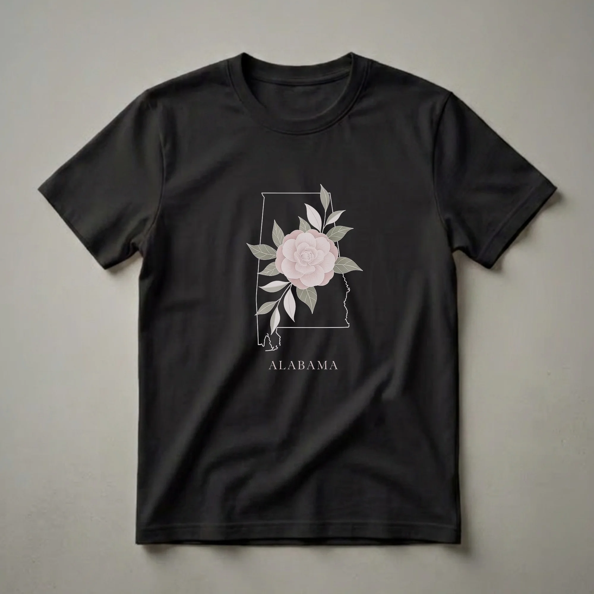 Alabama residents and fans can now wear their state pride with this distinctive graphic tee. The design features a clean, white outline of the state of Alabama, overlaid with a beautiful, soft pink camellia flower illustration. Accompanying the bloom are several muted green leaves, adding a touch of natural elegance to the artwork. Below the graphic, the word "ALABAMA" is elegantly scripted in a complementary font. This shirt is a wonderful way for anyone who calls Alabama home, or holds a special place for it in their heart, to express their connection. The camellia is the official state flower of Alabama, known for its vibrant blooms that appear in late winter and early spring, symbolizing the state's natural beauty. This tee works well for casual outings, family gatherings, or as a thoughtful gift for someone celebrating their Alabama roots. It's a staple in the collection for anyone wanting to showcase their Southern charm and state identity.
