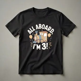 Three-year-olds are embarking on a new adventure, and this "All Aboard I'm 3!" train tee is the perfect way to celebrate their special day. The graphic features a cheerful cartoon train, complete with balloons and confetti, signaling a festive occasion. This shirt is worn by any child turning three who has a fascination with locomotives and the excitement of a birthday party. The bold lettering and playful imagery capture the energy of a young child reaching this exciting milestone. This t-shirt works well for birthday parties, family gatherings, or just everyday wear for the birthday boy or girl. It makes a thoughtful gift for a grandson, nephew, or any 3-year-old who dreams of chugging along on a train. Imagine their delight as they wear this eye-catching shirt on their big day, making memories that will last. The train itself, a symbol of journeys and destinations, mirrors the exciting path a three-year-old is just beginning. This fun graphic tee is sure to be a hit for any child celebrating their third year.