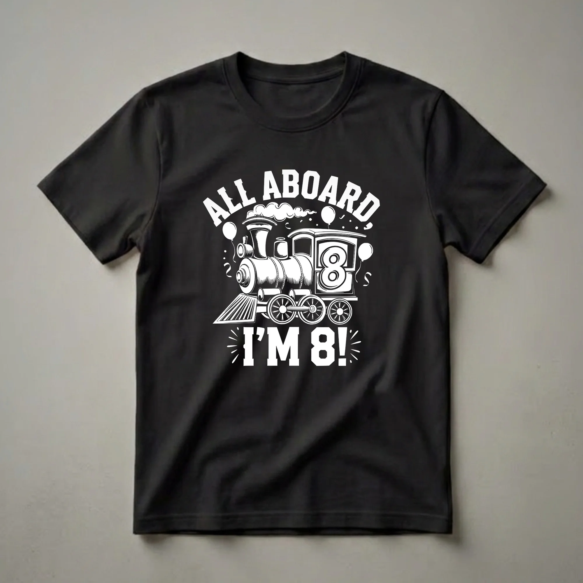 Eight-year-olds are stepping into a new phase of childhood, and this train-themed birthday shirt captures that excitement. The graphic features a classic steam locomotive, complete with billowing smoke and festive balloons, announcing 'ALL ABOARD, I'M 8!'. The number 8 is prominently displayed on the train's side, making it clear this tee is for the birthday boy or girl turning eight. This design is a fantastic way for any child fascinated by the power and adventure of trains to celebrate their special day. The vintage train imagery evokes a sense of nostalgia and wonder, appealing to young imaginations. This t-shirt works well for a birthday party, a family gathering, or as a special gift for the 8-year-old in your life. It’s a fun and memorable way for them to show off their age and their love for all things locomotive. Imagine the smiles when they unwrap this eye-catching shirt, ready to embark on their eighth year of adventures. This graphic tee is a staple for any young train enthusiast's birthday celebration.