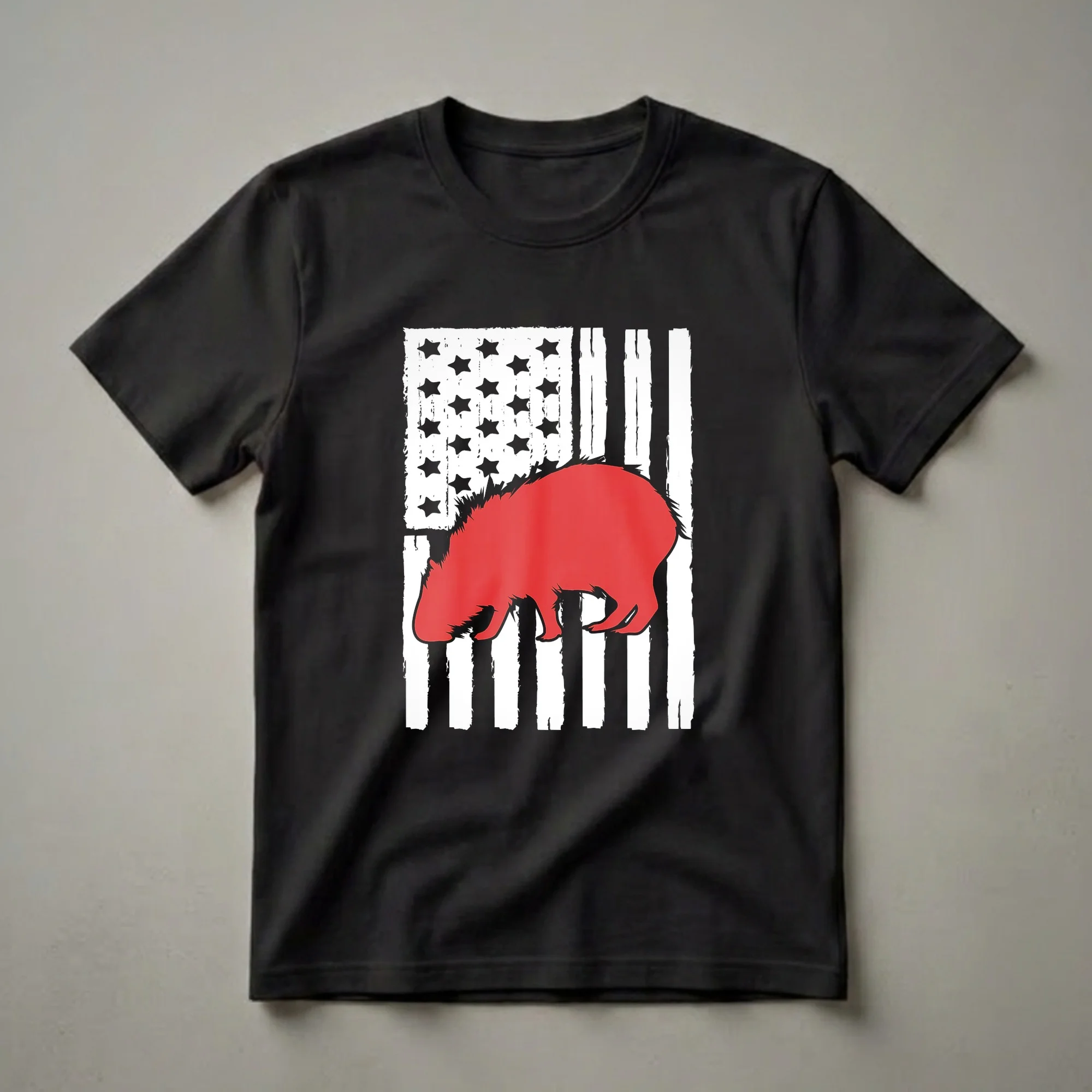 This distinctive t-shirt features a distressed American flag design, complete with bold white stripes and a field of black stars. Overlaid on this patriotic backdrop is a vibrant red silhouette of a capybara, the world's largest rodent. Capybaras are semi-aquatic mammals native to South America, known for their calm and social nature. They often live in groups near bodies of water, grazing on grasses and aquatic plants. This graphic tee is a unique way for any capybara admirer to express their national pride. It's a thoughtful gift for someone who cherishes these gentle giants and also celebrates the USA. This shirt works well for casual gatherings, Fourth of July celebrations, or simply as everyday patriotic apparel. Wear it to a barbecue or a local parade to showcase your dual passions for capybaras and America. The distressed style of the flag adds a vintage, rugged appeal to the design, making it stand out.