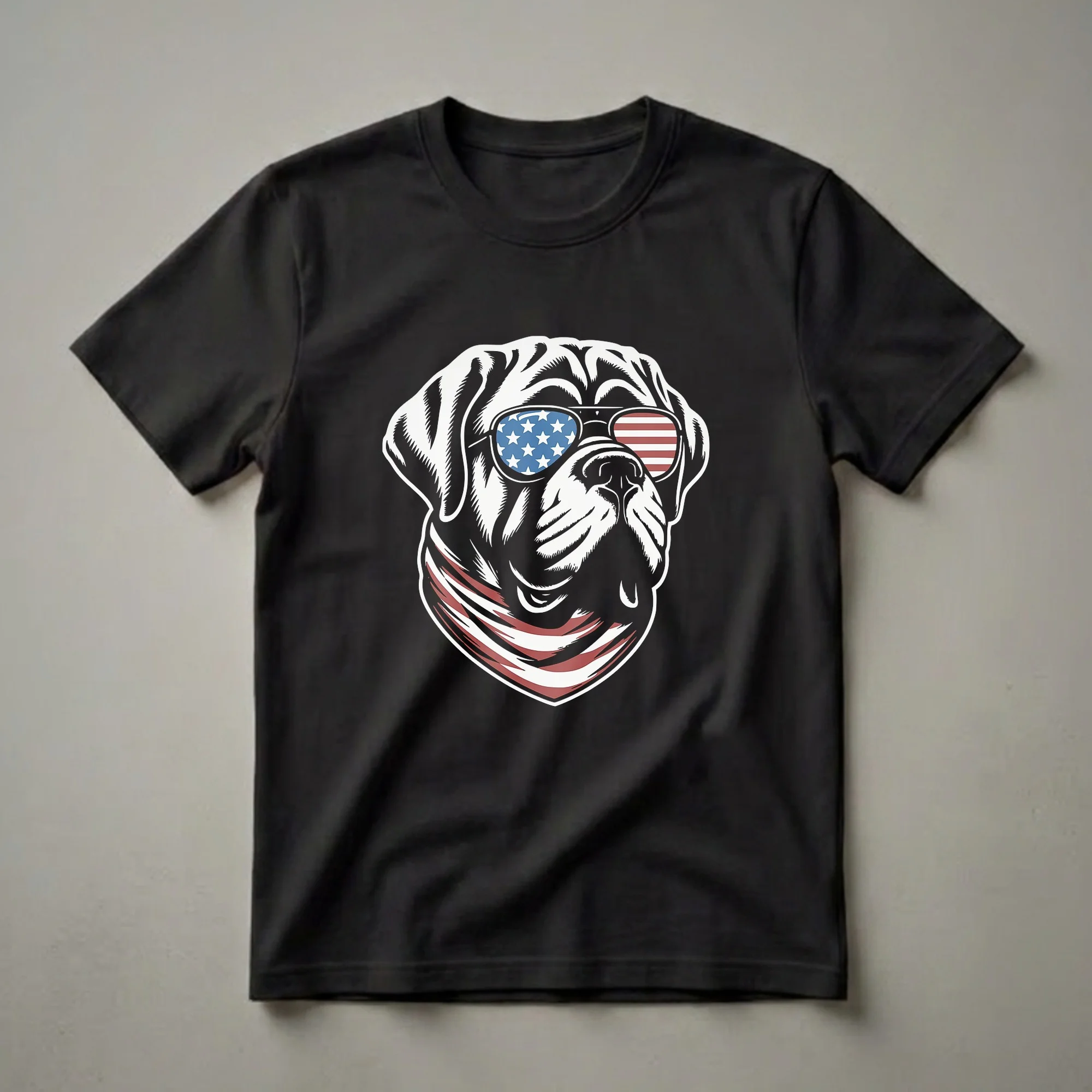 - Features a patriotic English Mastiff wearing sunglasses.