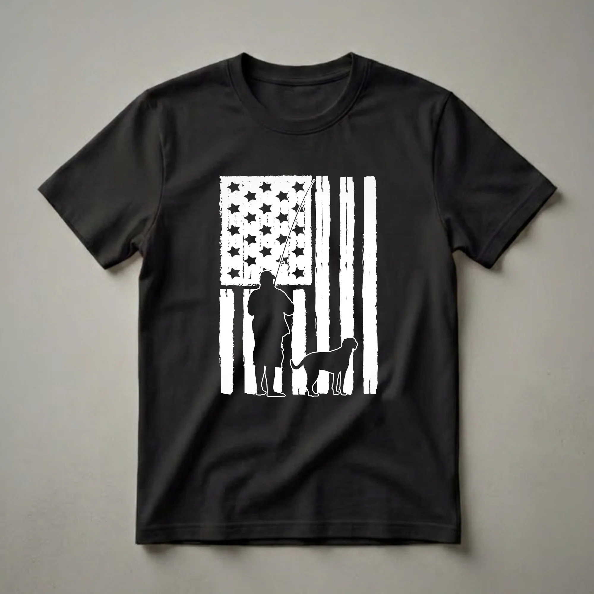 Anglers who cherish their canine companions and their country will appreciate this striking graphic tee. The design features a distressed American flag as the backdrop for a silhouette of a man holding a fishing rod, accompanied by his loyal dog. This shirt is a testament to the bond between a fisherman, his best buddy, and the nation. Fishing is a popular pastime enjoyed by millions, offering a chance to connect with nature and enjoy peaceful moments. Many anglers find that their dogs are the ideal companions for these outdoor excursions, adding to the enjoyment of the experience. This t-shirt makes a thoughtful gift for the fisherman in your life who loves dogs and patriotism. It's a go-to tee for casual outings, fishing trips, or simply relaxing at home. Wear it to your next fishing adventure or to show your national pride.