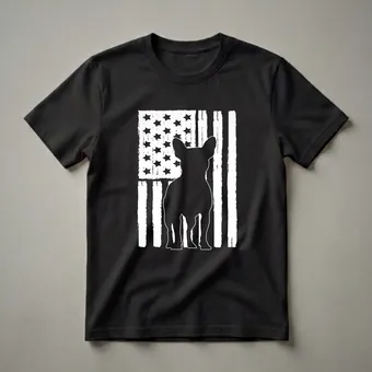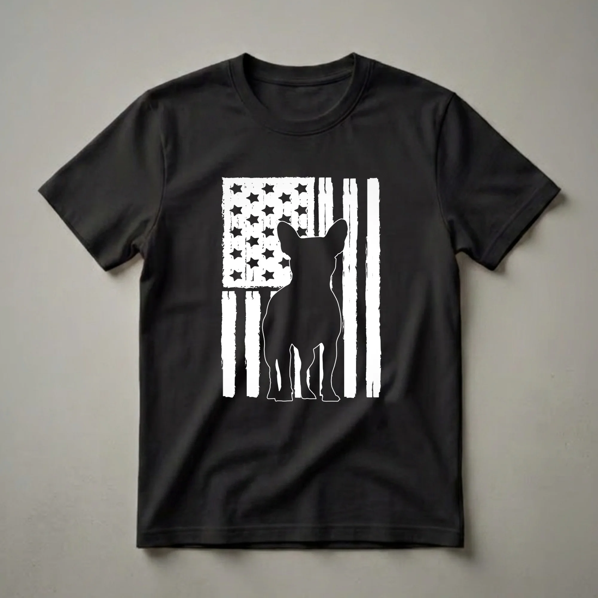Patriotic French Bulldog enthusiasts can now sport their love for both canine companions and country with this unique silhouette graphic tee.The design features a bold black silhouette of a French Bulldog, instantly recognizable by its distinctive bat ears and sturdy build, standing proudly against a distressed American flag. The flag graphic uses classic white stars on a black field and bold white stripes, giving it a vintage, worn-in feel that complements the dog's silhouette. French Bulldogs, originally bred in England as miniature bulldogs and later becoming popular in France, are known for their affectionate and playful nature. This shirt is a fantastic way for any Frenchie mom or dad to express their devotion to their canine companion and their country. It makes a thoughtful gift for birthdays, holidays, or just because for the French Bulldog enthusiast in your life. Wear this unique t-shirt to dog park meetups, casual outings, or patriotic celebrations to spark conversations and show off your dual passions.