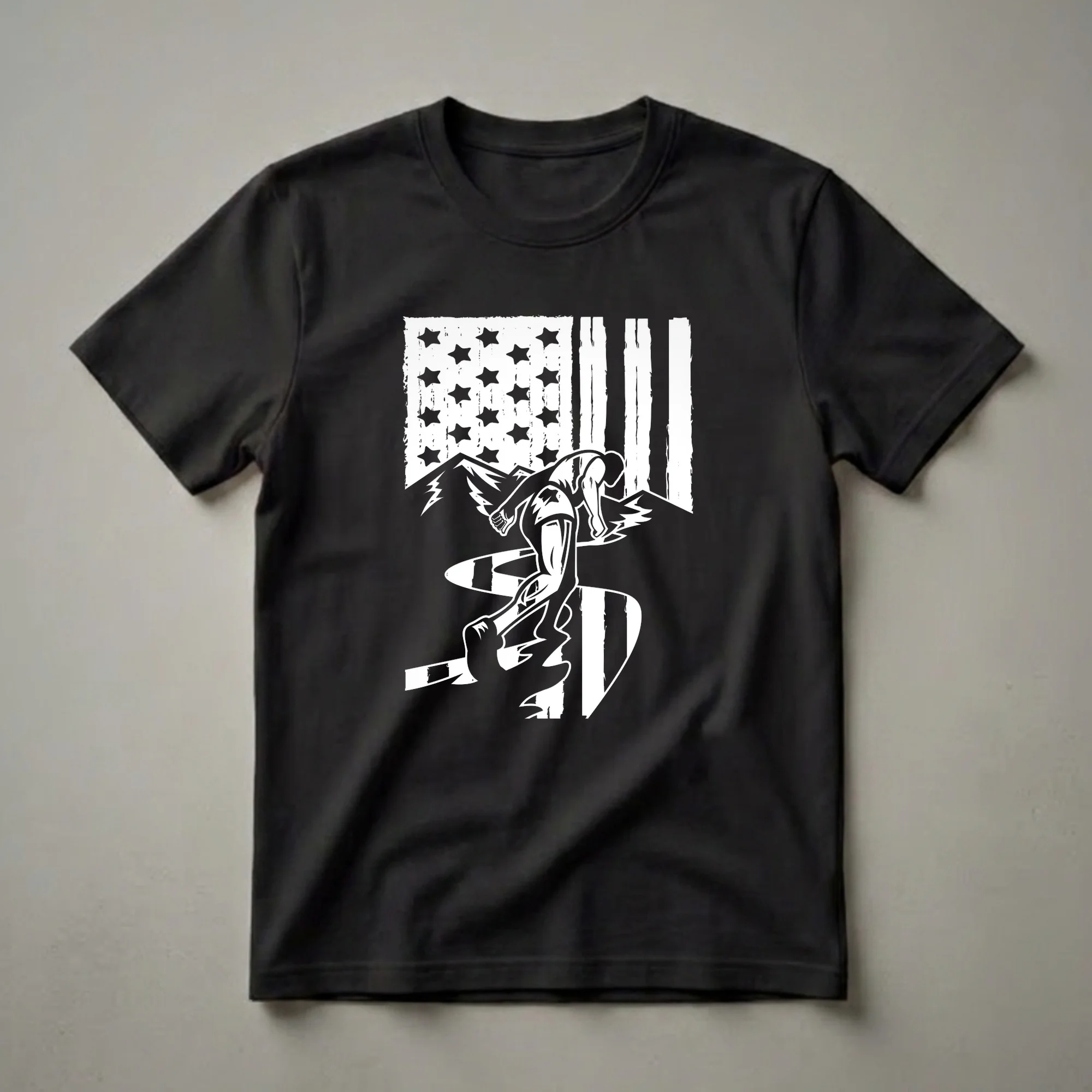 Marathon runners who push their limits will appreciate this eye-catching graphic tee. The design features a distressed American flag as the backdrop, with a dynamic silhouette of a runner in mid-stride. Jagged mountain peaks rise behind the runner, suggesting challenging terrain, while a winding path, reminiscent of a race course, leads the eye forward. This shirt is a testament to the dedication and endurance required for long-distance running. The bold graphic captures the spirit of American athletes who compete in marathons and other endurance events across the country. Whether you're training for your next race, celebrating a personal best, or simply want to wear your passion, this t-shirt is a go-to choice. It makes a thoughtful gift for the runner in your life who embodies perseverance and patriotism. Wear this shirt to your next training run, race day, or casual outing to showcase your commitment to the sport and your country. The imagery evokes the feeling of accomplishment after crossing the finish line, a moment many runners strive for.