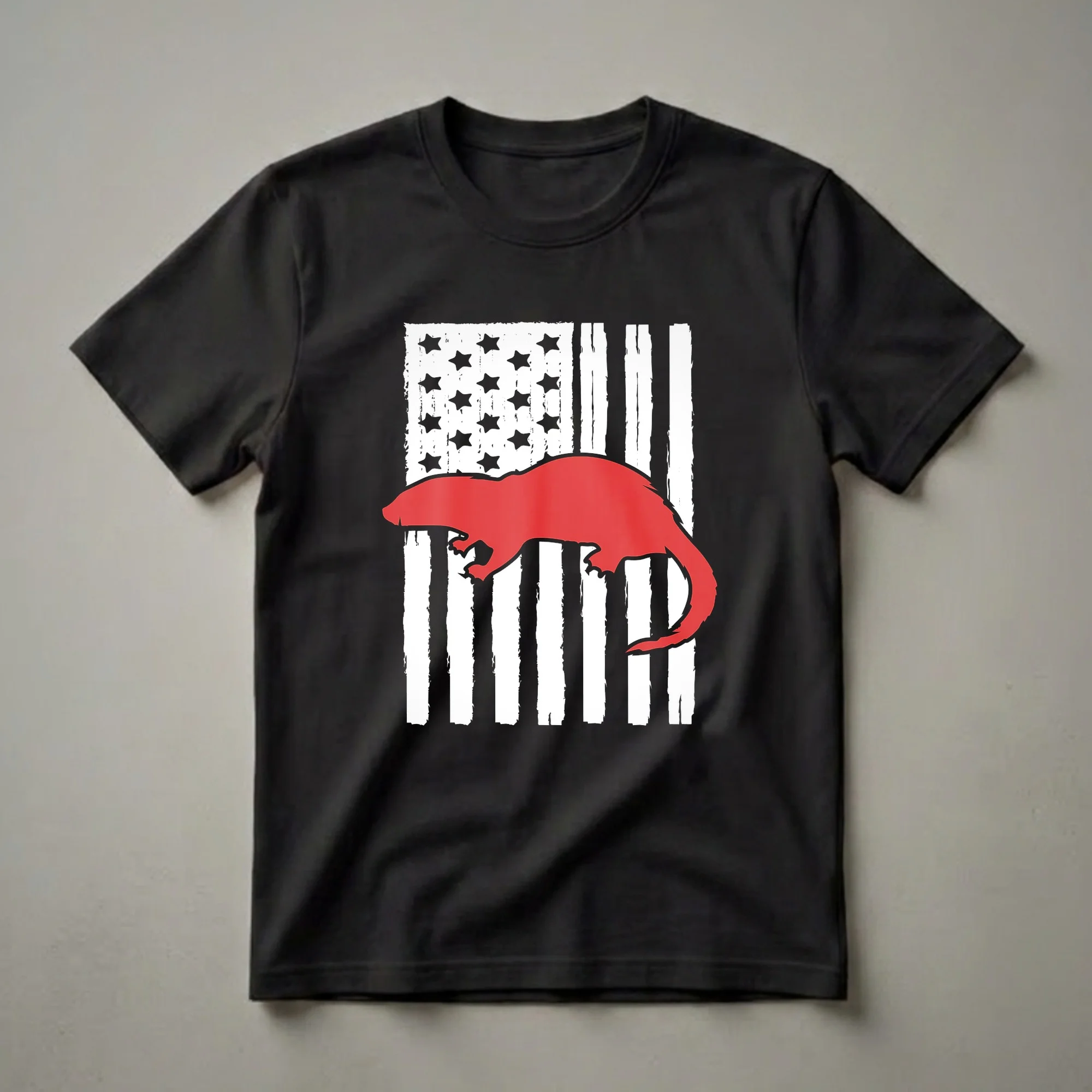 Animal lovers who also have a deep appreciation for the United States will reach for this unique t-shirt. The design features a distressed American flag with bold white stripes and a field of black stars, overlaid with a vibrant red silhouette of an otter. Otters are semi-aquatic mammals known for their playful nature and sleek bodies, often found in freshwater habitats across North America. This graphic tee is a fantastic way for otter enthusiasts to showcase their passion and patriotism. It makes a thoughtful gift for birthdays, holidays, or any occasion for the animal lover in your life. Wear this shirt to casual outings, nature walks, or while celebrating national holidays to express your unique style and interests. This apparel is a staple for anyone who cherishes both wildlife and country.