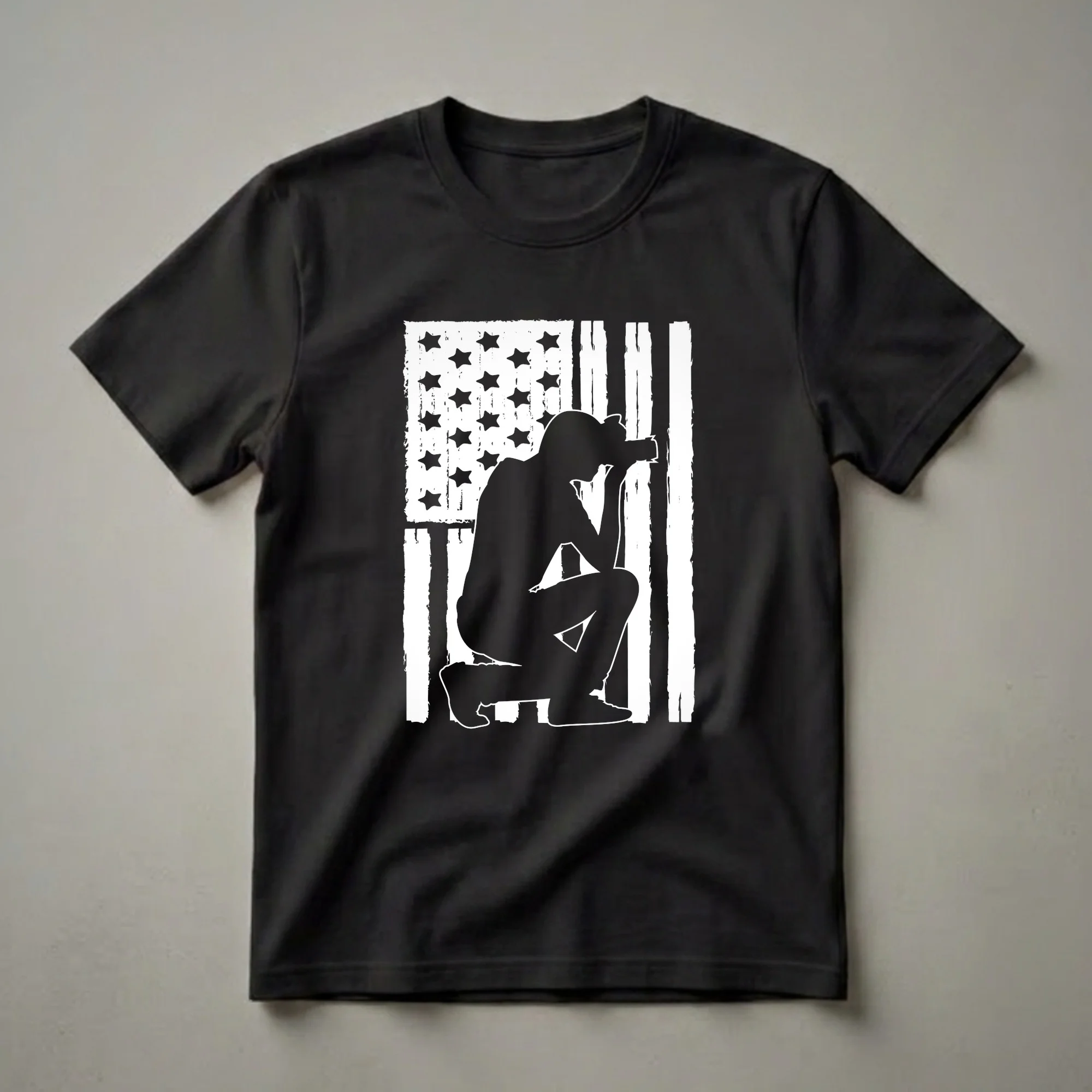 Photography lovers who appreciate patriotic imagery will reach for this unique t-shirt. The design features a silhouette of a photographer in a crouching pose, actively engaged with their camera, set against a distressed American flag. This graphic tee merges a passion for capturing moments with a deep appreciation for the United States. The distressed texture of the flag adds a vintage, rugged feel, making it a standout piece for any wardrobe. This shirt is a thoughtful gift for the photographer in your life, whether they specialize in landscapes, portraits, or event coverage. It’s a great way for them to express their dual interests in their craft and their country. Wear this shirt to photography meetups, casual outings, or while out on a photo expedition to showcase your dedication to both your art and your heritage. The bold graphic makes a statement without being overly loud, resonating with those who find beauty in both the lens and the stars and stripes.