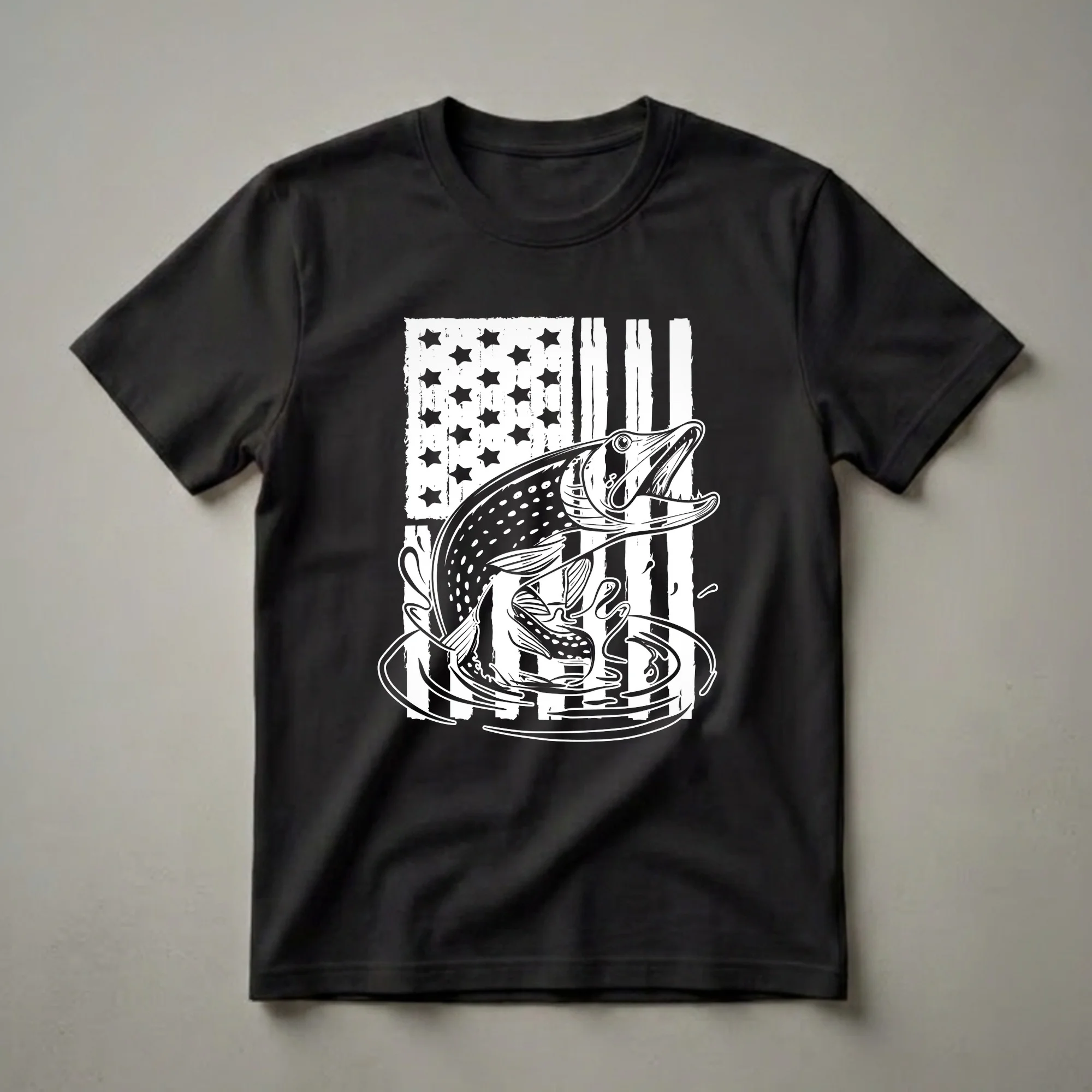 Anglers who appreciate the thrill of the catch will reach for this distinctive t-shirt. The design prominently features a dynamic illustration of a pike, a formidable freshwater predator known for its aggressive strikes and impressive size, leaping from stylized water. Behind the fish, a distressed American flag provides a patriotic backdrop, symbolizing a love for both the sport and the country. This graphic tee is a testament to the dedication of fishermen who spend their days on the water, seeking out these powerful game fish. Pike are found in many northern freshwater lakes and rivers across North America and Eurasia, often inhabiting weedy areas where they ambush their prey. This shirt makes a thoughtful gift for the fisherman in your life, whether they are celebrating a birthday or just love to cast a line. Wear it to your next fishing trip, to a casual outing with friends, or while watching your favorite sports team.