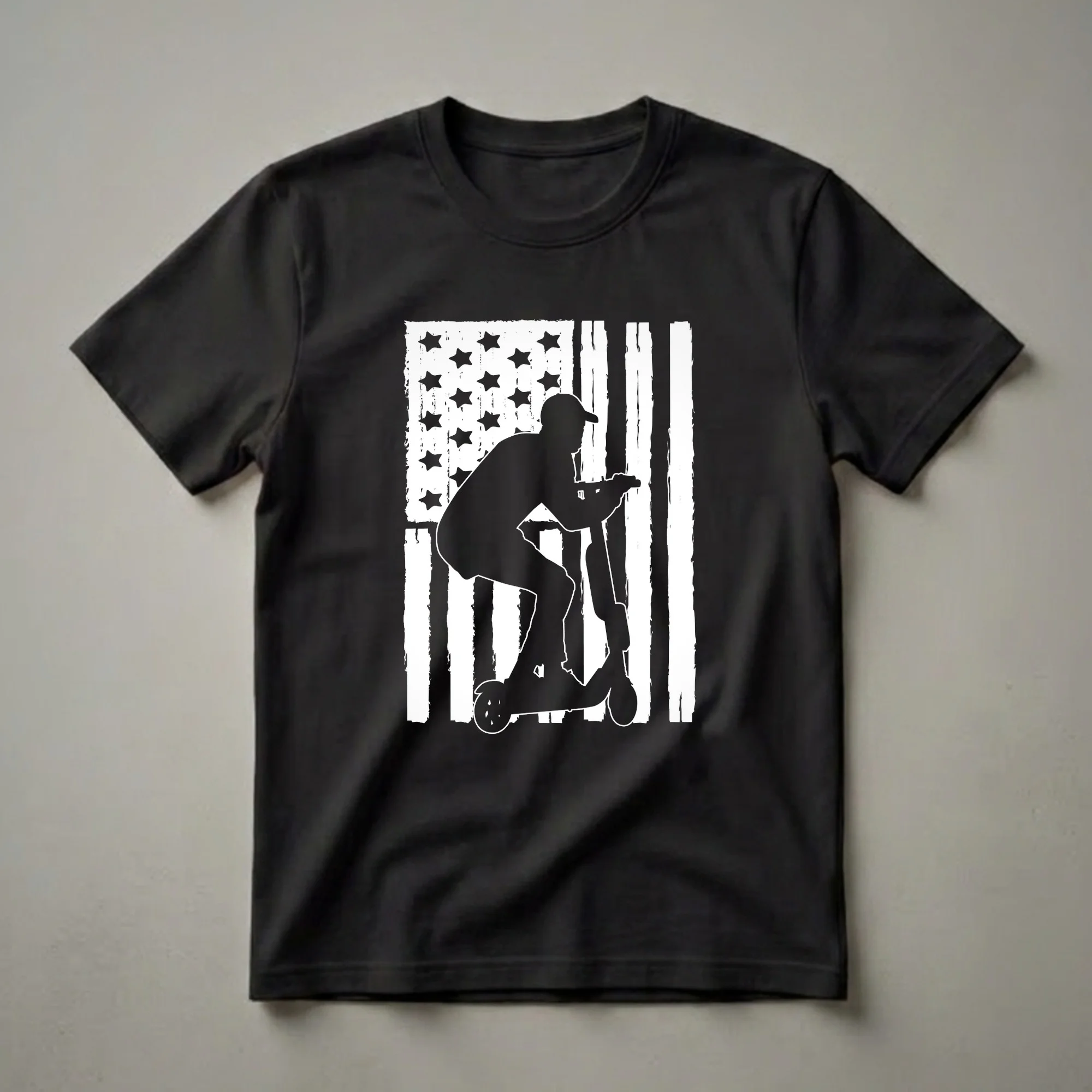 - Graphic t-shirt for scooter riders and American flag enthusiasts.