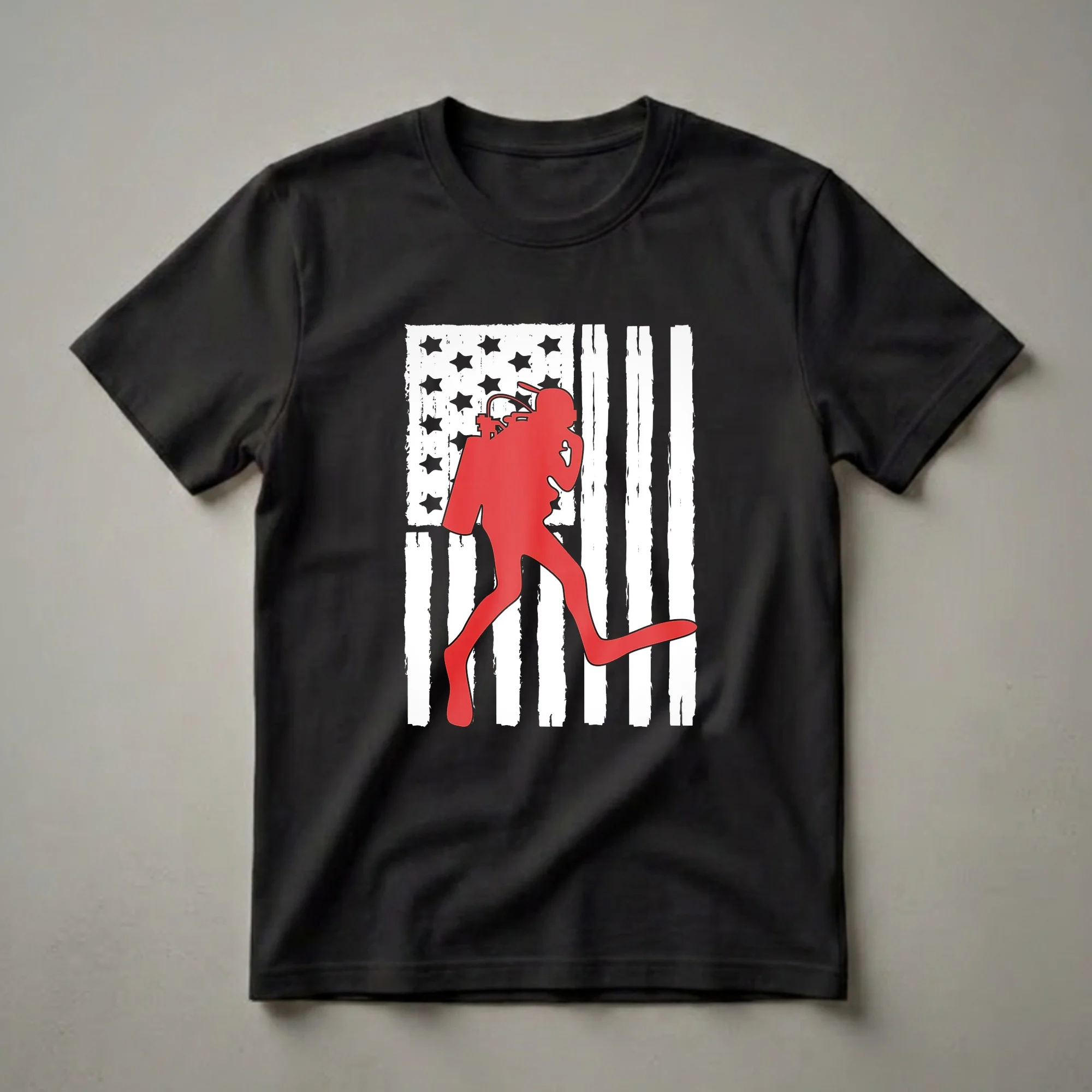 Scuba divers who feel a deep connection to the United States will reach for this eye-catching graphic tee. The design features a bold red silhouette of a scuba diver, complete with tank and mask, set against a distressed American flag. The flag's white stripes have a textured, brushstroke appearance, and the blue field with stars is rendered in black, creating a striking contrast. This shirt is a thoughtful gift for any diver who also holds a strong sense of patriotism, perhaps for a birthday or a holiday. It's a great way for divers to express their dual passions, whether they are exploring the vibrant coral reefs of the Florida Keys or the historic shipwrecks off the coast of North Carolina. Wear this t-shirt to your next dive trip, to a casual gathering with fellow divers, or simply as a statement piece that showcases your American pride and love for the underwater world. This apparel is a staple for any diver's collection.