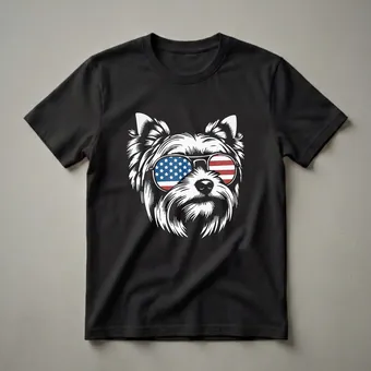 - Features a striking graphic of a Yorkshire Terrier wearing American flag sunglasses.