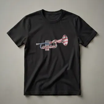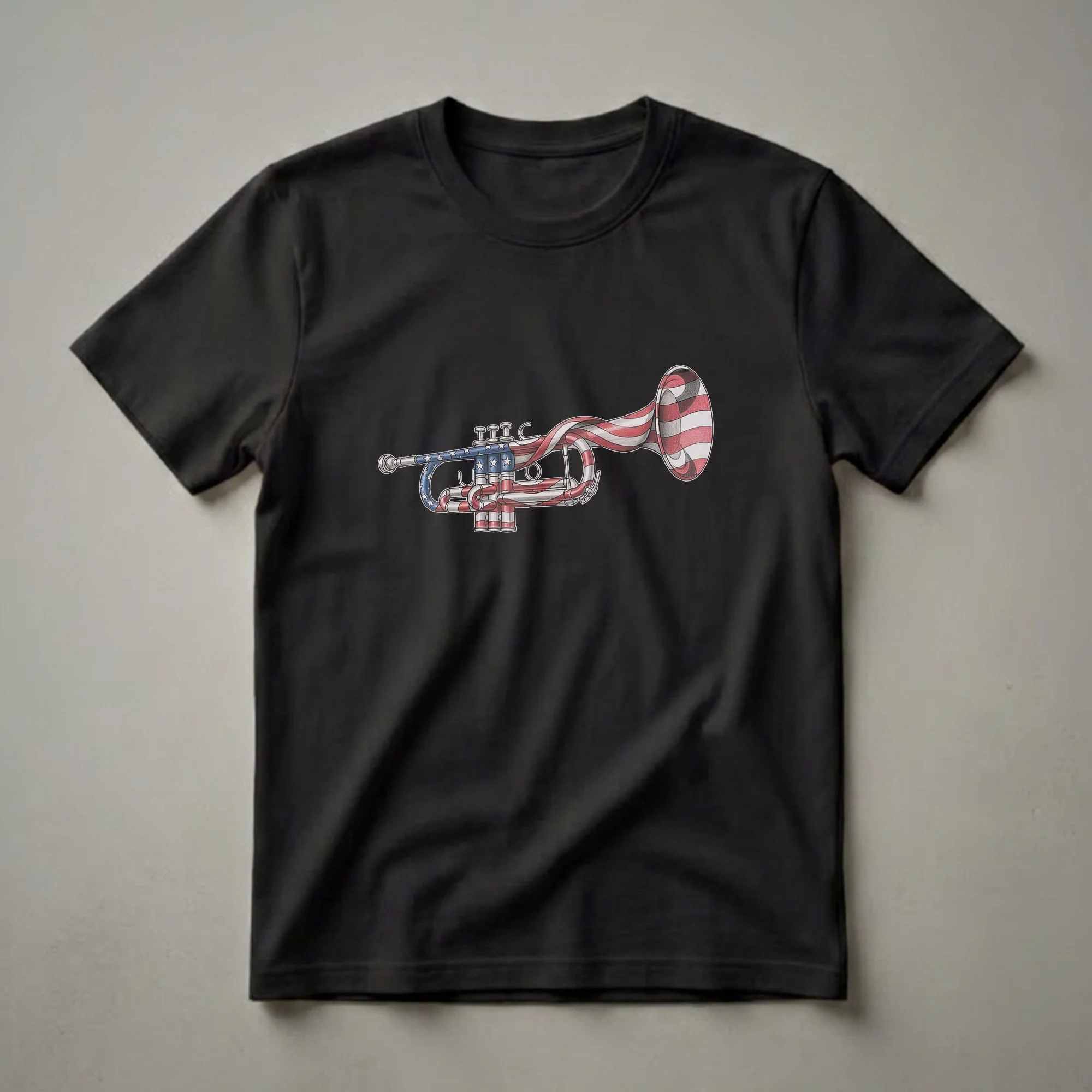 Trumpet players who want to showcase their passion for music and country will reach for this striking graphic tee. The design features a detailed pencil sketch of a trumpet, intricately wrapped with the iconic stars and stripes of the American flag. The blue section with white stars covers the valve casing, while red and white stripes flow across the tubing and bell, creating a dynamic and patriotic visual. The trumpet, a member of the brass instrument family, is known for its bright, piercing tone and is a staple in orchestras, jazz ensembles, and marching bands. This shirt is a thoughtful gift for the trumpet player in your life, whether they are a seasoned professional, a dedicated student, or a proud band parent. It's great to wear to band practice, concerts, music festivals, or casual outings where you want to express your musical identity and national pride. This unique t-shirt celebrates the artistry of both music and patriotic symbolism, making it a standout piece in any musician's wardrobe.