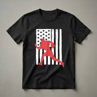 Football fans and players will appreciate this striking graphic t-shirt featuring a dynamic red silhouette of an American football player in mid-action. The player is depicted with a football in hand, poised to make a play, set against a distressed American flag backdrop with bold white stripes and black stars. This design captures the spirit and intensity of the sport. Football, a sport with a rich history dating back to the late 19th century, requires strategy, athleticism, and teamwork. Whether you're a quarterback leading the offense, a defensive player making a crucial tackle, or a dedicated fan cheering from the stands, this shirt is a great way to express your passion. It makes a thoughtful gift for the football enthusiast in your life, great to wear to games, tailgates, or casual outings. This comfortable tee is a staple for any football lover's wardrobe.