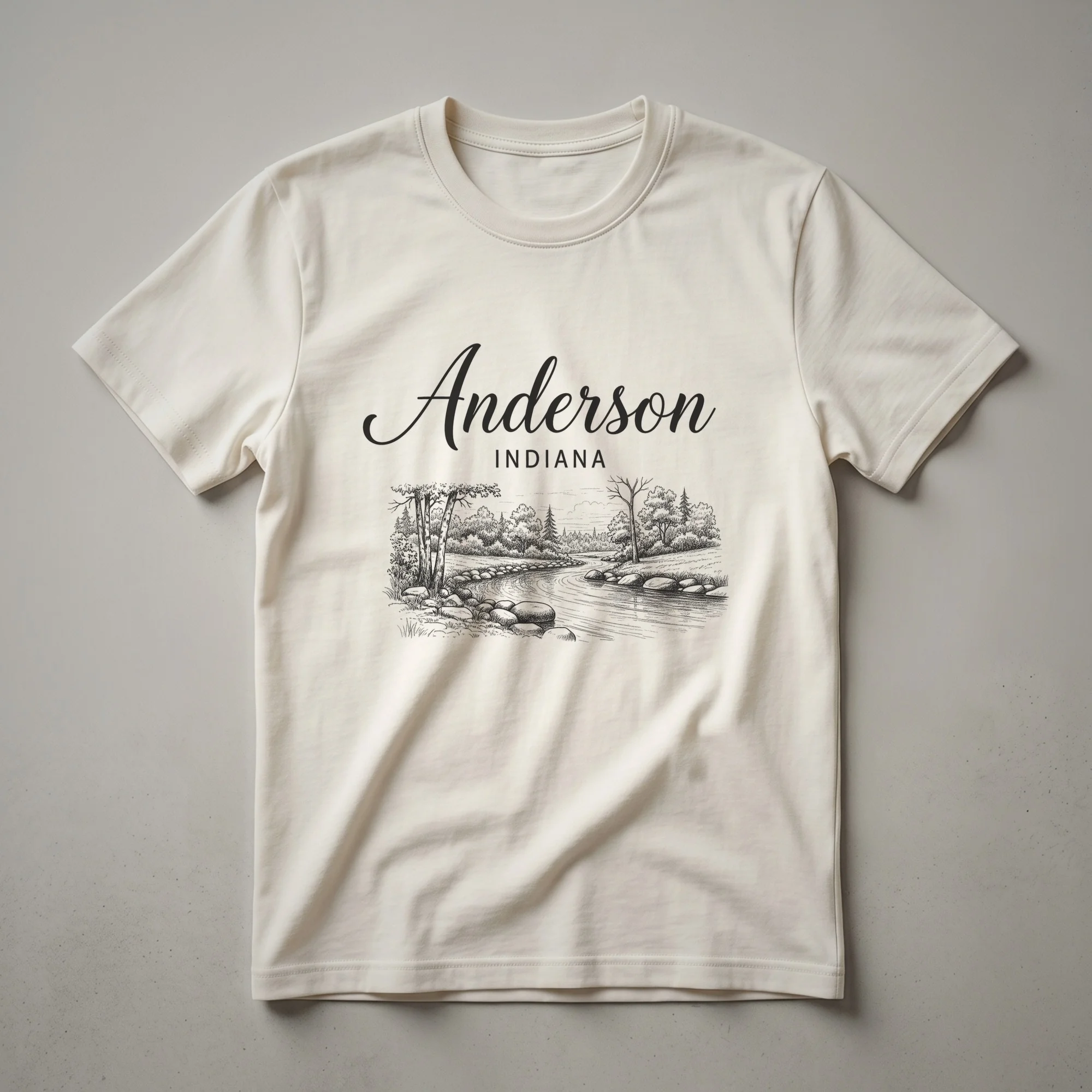 Anderson, Indiana residents and visitors can now wear their hometown pride with this distinctive sketch art t-shirt. The design captures the natural beauty of the area, depicting a flowing river winding through a wooded landscape. Detailed linework illustrates trees, rocks, and the gentle movement of the water, evoking a sense of tranquility and connection to the outdoors. This graphic tee is a thoughtful gift for anyone who calls Anderson home or has fond memories of its scenic spots. The artistic rendering offers a unique way to represent the heart of the Midwest. Whether you're exploring the local trails or enjoying a casual day out, this shirt serves as a conversation starter and a reminder of the charm of Indiana. It's a staple in the collection for those who appreciate artistic interpretations of their favorite places. This apparel is a great way to celebrate your roots or give a meaningful present to a friend or family member who cherishes their connection to Anderson. Wear it to local events, family gatherings, or simply as a comfortable everyday tee that showcases your Hoosier spirit.