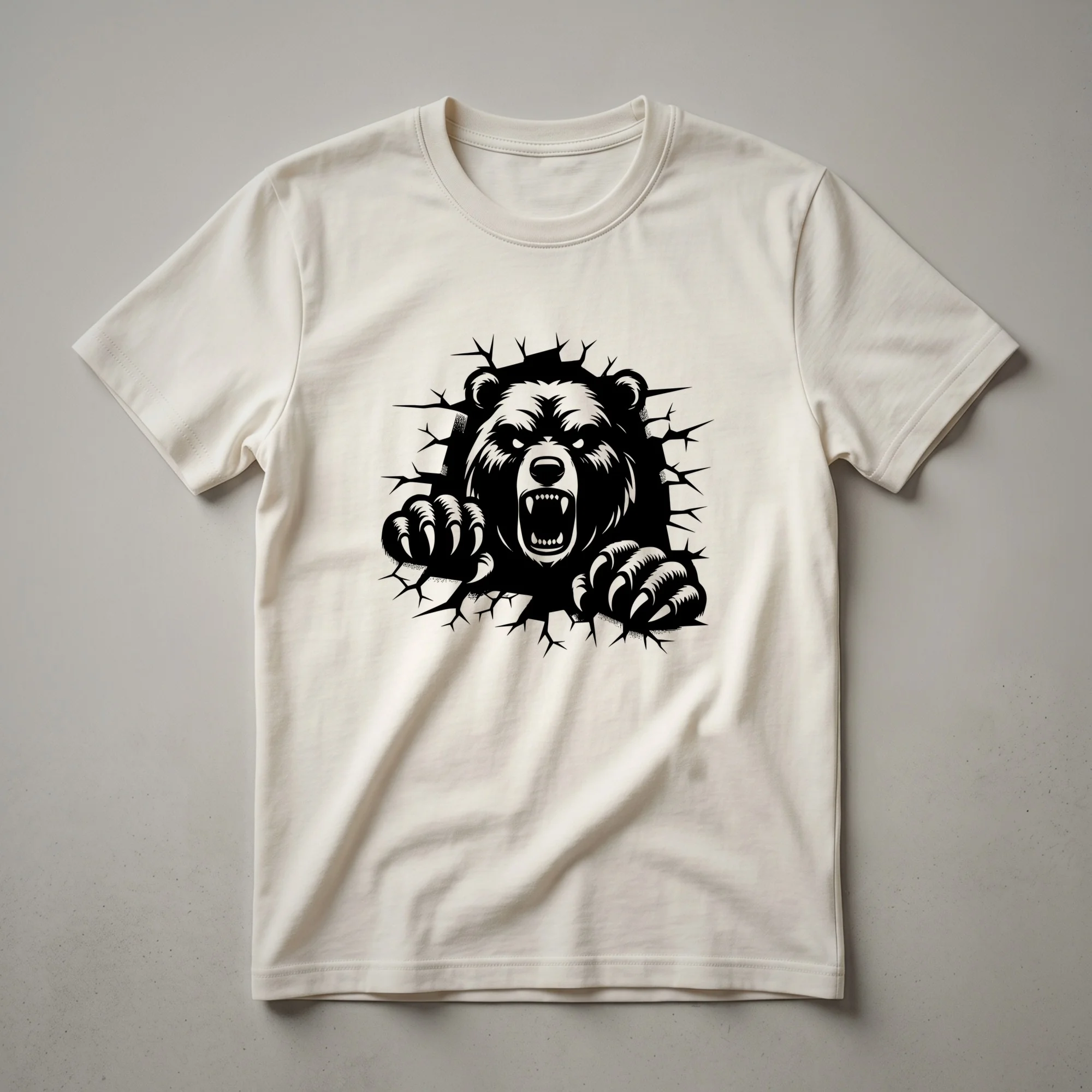 Nature lovers and wildlife enthusiasts will appreciate this striking t-shirt featuring a vintage-style drawing of an angry bear. The detailed illustration captures the raw power of the bear, with its sharp claws prominently displayed, evoking a sense of untamed wilderness. Bears, such as the North American brown bear or grizzly, are apex predators known for their strength and adaptability, inhabiting diverse environments from forests to mountains. This graphic tee serves as a bold statement piece for anyone who admires these magnificent creatures. It's a go-to tee for casual outings, hikes, or simply relaxing at home. This shirt makes a thoughtful gift for the outdoorsman or woman in your life who has a deep appreciation for the wild. Wear it to your next nature walk or outdoor adventure to showcase your connection to the animal kingdom. This apparel is a staple for any wildlife art collector.