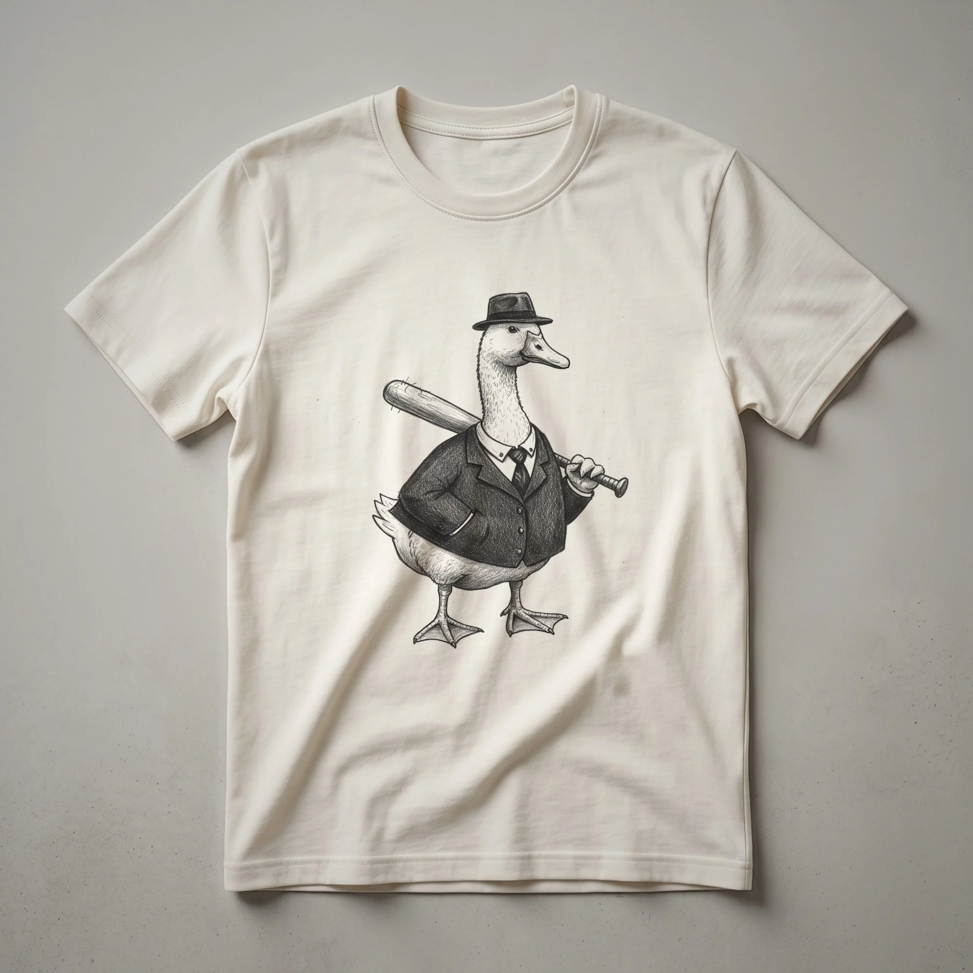 Bird lovers and baseball fans alike will appreciate this striking graphic tee featuring an angry goose ready to hit a home run. The artwork depicts a goose in mid-swing, wearing a classic baseball cap and gripping a bat with fierce determination. This design captures the unexpected intersection of avian aggression and America's favorite pastime. Geese, known for their territorial nature and surprisingly strong protective instincts, are often seen in and around baseball fields, making this a fitting visual for fans who appreciate a bit of wildness. This t-shirt is a fantastic way for ornithology enthusiasts or amateur athletes to express their unique interests. It makes a thoughtful gift for the bird watcher in your life or for someone who enjoys a good laugh with a sports-themed design. Wear this shirt to your next game, a casual outing, or while enjoying nature walks. It's a conversation starter that celebrates both the natural world and the spirit of competition. This shirt is a staple for anyone who enjoys a touch of humor and a bold graphic statement.