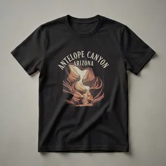 Antelope Canyon, a slot canyon in Arizona, is renowned for its breathtaking natural beauty and the way light filters through its narrow passages. This graphic tee features a vintage-style drawing that vividly illustrates the swirling, wave-like rock formations characteristic of this iconic Southwest landmark. The artwork captures the warm hues of orange, yellow, and brown, evoking the sandstone walls sculpted by wind and water over millennia. Below the dramatic canyon walls, a winding path suggests the journey through this natural wonder. This shirt is a staple for anyone who has experienced the magic of Arizona's landscapes or dreams of visiting. It's a thoughtful gift for travelers, hikers, photographers, or anyone with a love for the American Southwest's unique geological formations. Wear this tee to relive memories of your visit or to inspire your next adventure to the desert.