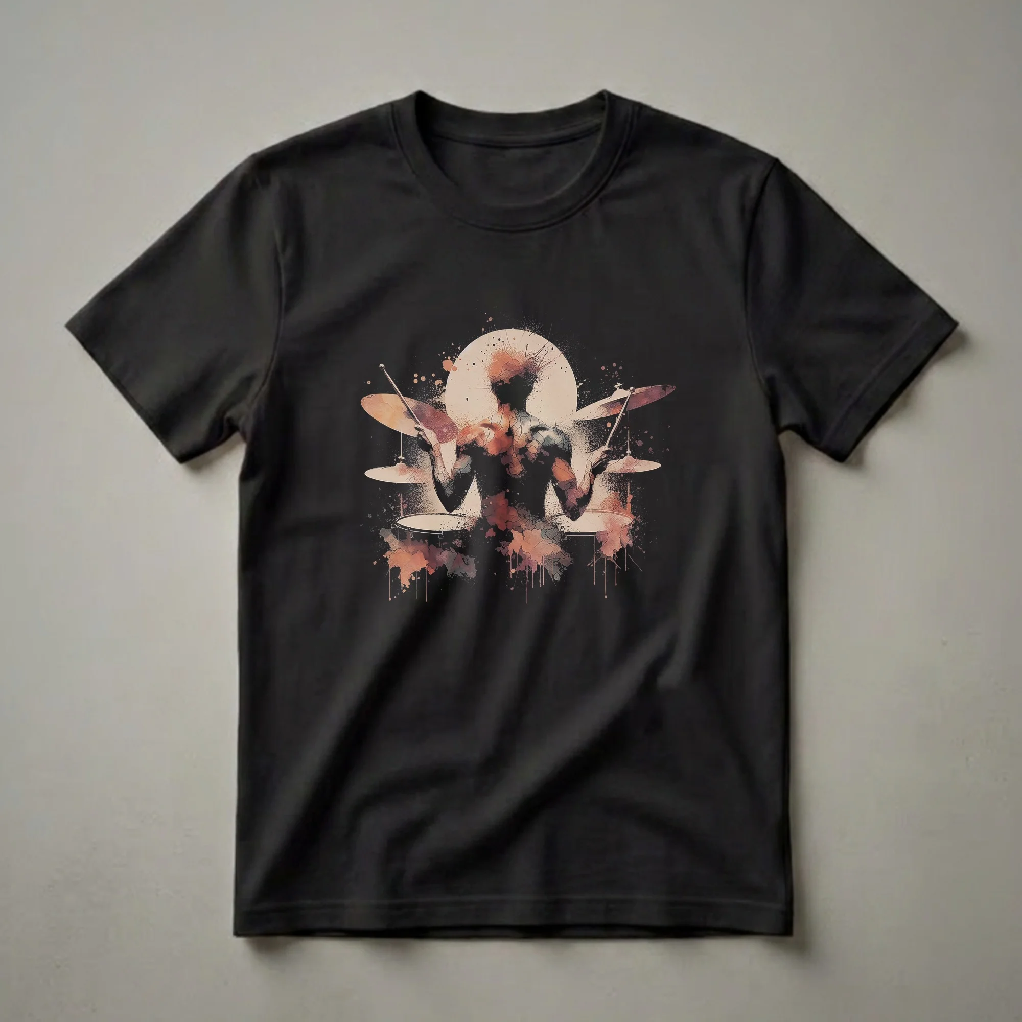 Drummers who want to express their passion through their apparel will reach for this striking t-shirt. The design features a silhouette of a musician in the midst of playing a drum set, rendered in a dynamic watercolor and splatter art style. A large, pale circle forms the backdrop, behind the drummer, whose form is depicted with textured, cracked lines and vibrant splashes of orange, red, and grey. This artistic interpretation captures the energy and intensity of a live performance. Percussion is a fundamental element of music, providing rhythm and drive across countless genres, from jazz and rock to classical and electronic music. This tee works well for drummers of all levels, whether they are practicing in their garage, performing on stage, or attending music events. It makes a thoughtful gift for the drummer in your life, celebrating their dedication to the art of rhythm. Wear this shirt to band practice, a concert, or any casual outing to showcase your love for drumming.