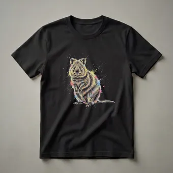 Quokka lovers will reach for this eye-catching graphic tee, featuring a vibrant artistic rendering of the famously cheerful marsupial. The design showcases a quokka in a dynamic splatter paint style, with splashes of yellow, pink, blue, and green bursting around its form against a solid black background. Known for their 'smiling' appearance, quokkas are native to a small part of southwestern Australia, primarily Rottnest Island, where they are a major tourist attraction. This shirt is a thoughtful gift for anyone who appreciates unique animal art or has a special fondness for these adorable Australian creatures. It's a striking piece of apparel that stands out, making it a go-to tee for casual outings or as a conversation starter. Wear this t-shirt to express your admiration for wildlife and unique artistic expressions, a thoughtful choice for nature enthusiasts or those who simply enjoy a bold, colorful design. This quokka shirt is a fantastic way to bring a piece of Western Australia's unique fauna into your wardrobe, celebrating the animal's joyful demeanor and distinctive look.