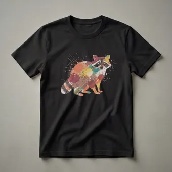 - Artistic raccoon tee with a dynamic watercolor paint splatter effect.