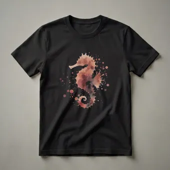 Marine life enthusiasts who appreciate the delicate beauty of the ocean will reach for this artistic seahorse t-shirt. The design features a striking silhouette of a seahorse rendered in a watercolor style, complete with subtle splatters and washes of earthy tones like rust, brown, and hints of grey. This eye-catching graphic tee captures the ethereal quality of these fascinating creatures. Seahorses, known for their unique appearance and the male's role in carrying the young, inhabit shallow seas around the world, often found in coral reefs and seagrass beds. This shirt is a thoughtful gift for anyone captivated by the underwater world, whether they are divers, marine biologists, or simply admire the ocean's wonders. Wear this unique seahorse shirt to your next beach outing, casual gathering, or while exploring coastal areas to express your connection to marine ecosystems. It's a staple in the collection for those who find beauty in the sea's inhabitants.