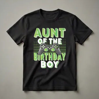 - Features a bold green gradient "AUNT OF THE BIRTHDAY BOY" design with a video game controller.