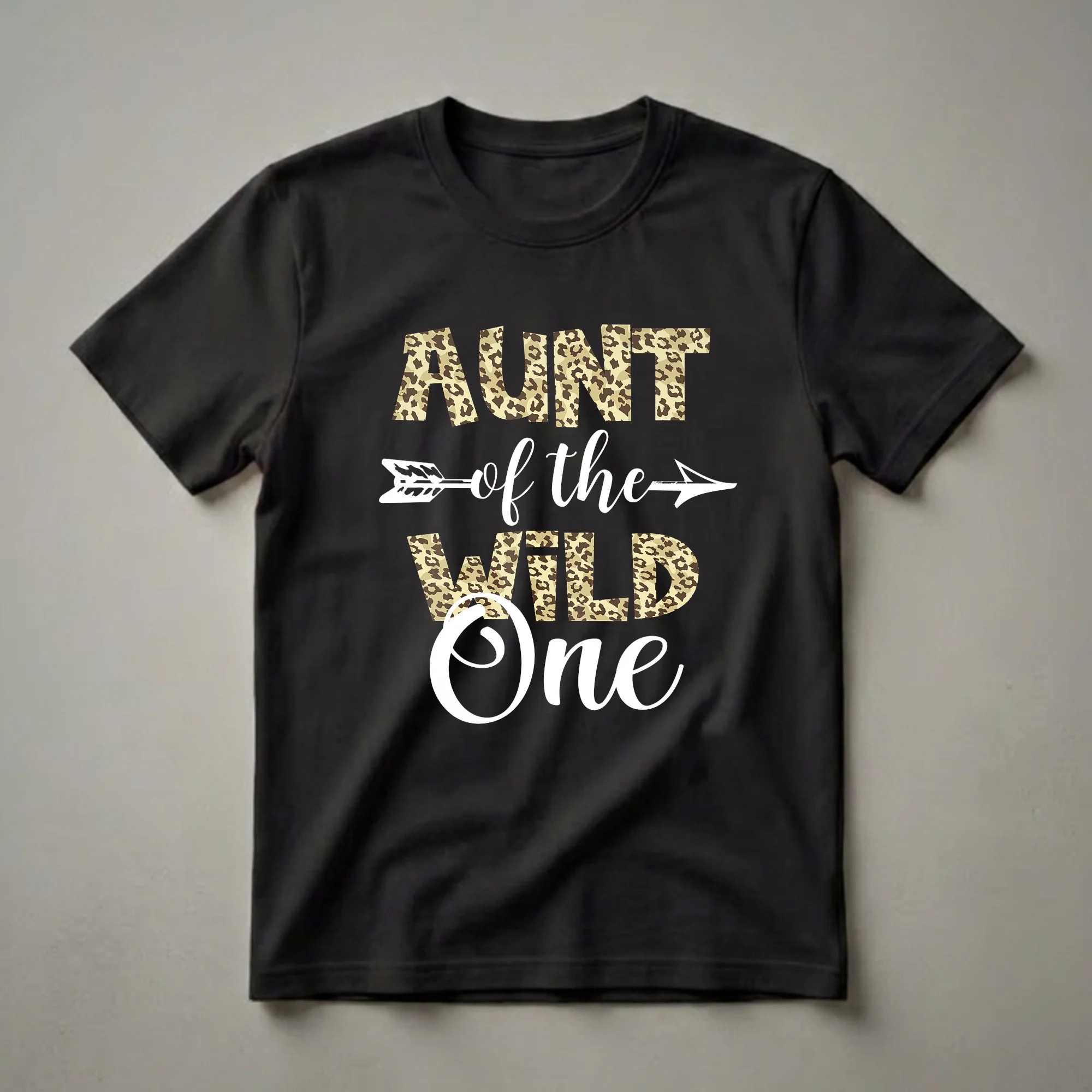 The aunt of the wild one can celebrate a special first birthday in style with this eye-catching graphic tee. The design features bold, block letters spelling out "AUNT" and "WILD" filled with a classic leopard print pattern in shades of tan and brown. Between these words, a white arrow points to the right, symbolizing direction and adventure. The word "One" is written in a large, elegant white script font, completing the "Wild One" theme. This shirt is a thoughtful gift for any aunt attending a zoo-themed or jungle-themed first birthday party. It’s a fun way for her to show her connection to the birthday child and embrace the wild spirit of the celebration. Imagine her wearing this t-shirt while helping with party games or taking photos with the birthday boy or girl. This tee is a staple for any aunt who loves to be part of her niece's or nephew's milestone birthdays, making her feel special and festive.