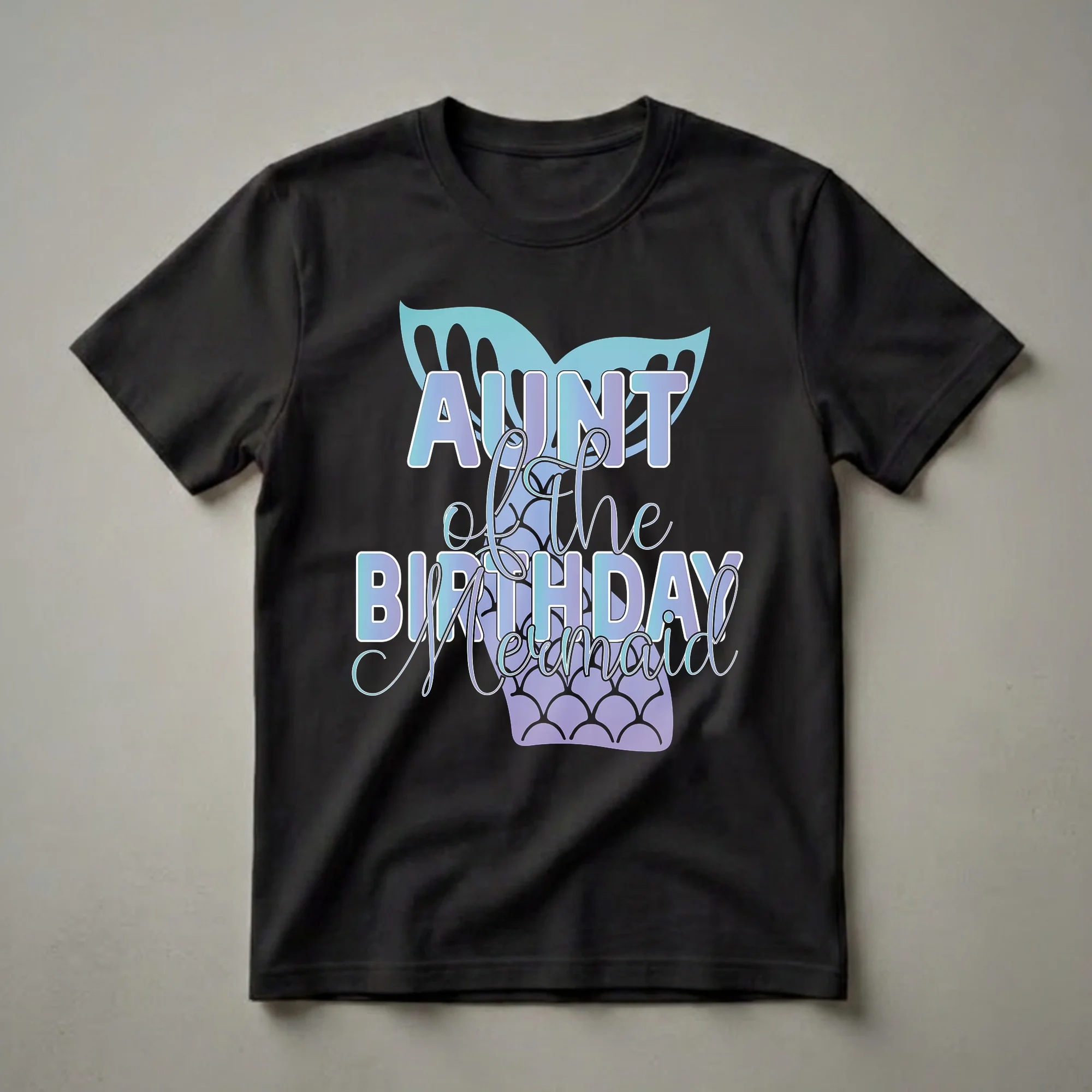 Aunties who want to show their support for the birthday girl will reach for this eye-catching tee. The design features bold, gradient lettering that reads "Auntie of the Birthday Mermaid." Beneath the text, a stylized mermaid tail with iridescent scales in shades of purple and teal is prominently displayed, topped by a flowing mermaid fin in a matching gradient. This graphic t-shirt is a thoughtful gift for any aunt celebrating a niece's mermaid-themed birthday party. It’s a fun way to coordinate with the birthday girl and other family members, creating memorable photos and a festive atmosphere. Imagine wearing this shirt to a birthday brunch or a pool party, embracing the magical theme. This shirt is a staple for any aunt who loves to be part of the birthday magic, making her feel special and connected to the celebration. It’s a unique way to express pride in being the aunt of the birthday mermaid, adding a touch of whimsy to the special day. This apparel is a fantastic addition to any birthday outfit, ensuring the aunt stands out with her celebratory spirit.