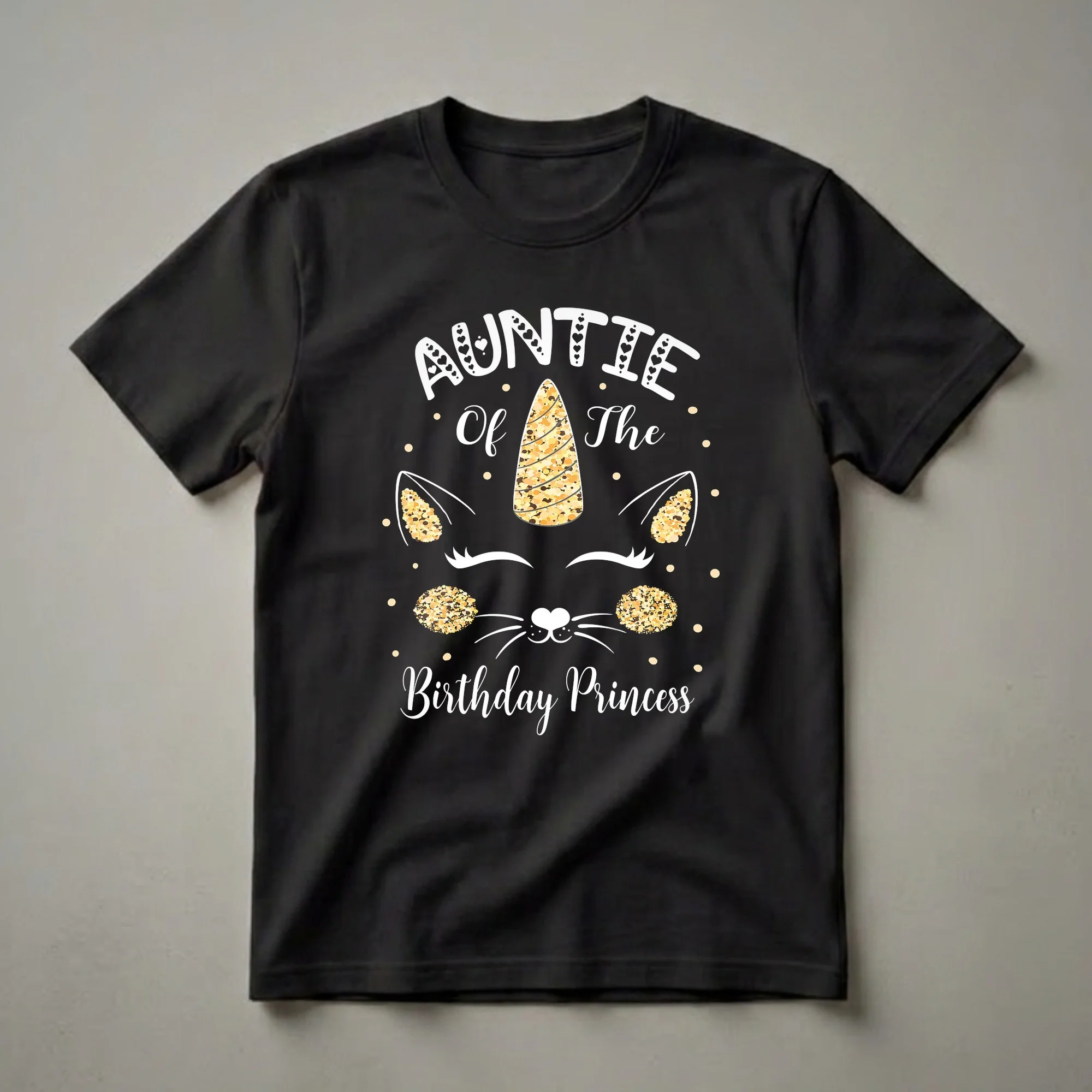 - Auntie of the Birthday Princess caticorn graphic tee.