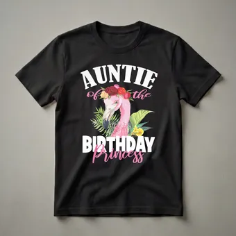 Aunties who want to show their love for the special birthday girl will reach for this vibrant graphic tee. The design prominently features a beautiful pink flamingo adorned with a colorful floral crown, set against a backdrop of lush tropical leaves and bright yellow flowers. Bold white text declares 'Auntie of the Birthday Princess,' with 'of the' in a delicate pink script. This eye-catching t-shirt is a wonderful way for an aunt to express her pride and excitement for her niece's celebration. Flamingos, known for their social nature and vibrant plumage, are often associated with tropical destinations and festive occasions, making them a fitting symbol for a birthday party. This shirt is a thoughtful gift for any aunt looking to make her niece's birthday even more memorable. Wear this tee to the birthday party, a family brunch, or any occasion where you want to proudly represent your role as the best aunt.