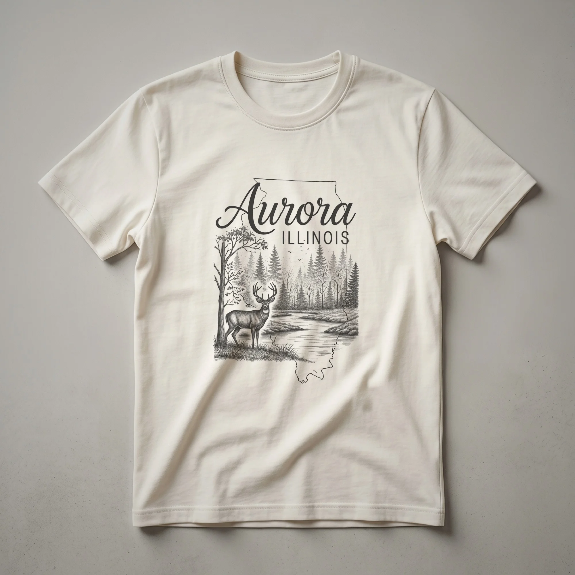 Aurora, Illinois residents who appreciate the natural beauty surrounding their city will reach for this distinctive graphic tee. The design captures a serene forest scene, complete with a majestic deer standing near a tranquil body of water, all artfully rendered within the outline of the state of Illinois. The word "Aurora" is elegantly scripted above "ILLINOIS" in a clean, modern font. This shirt is a thoughtful gift for anyone who calls Aurora home or has fond memories of the area's natural landscapes. The detailed sketch style evokes a sense of timelessness, reminiscent of the rich woodlands and wildlife found throughout the state. Whether you're exploring local parks or simply want to display your Illinois pride, this t-shirt offers a unique way to connect with the spirit of Aurora. It's a staple in the collection for those who love the Great Lakes region and its abundant natural wonders. Wear it to casual outings, nature walks, or while sharing stories of your favorite Illinois spots.