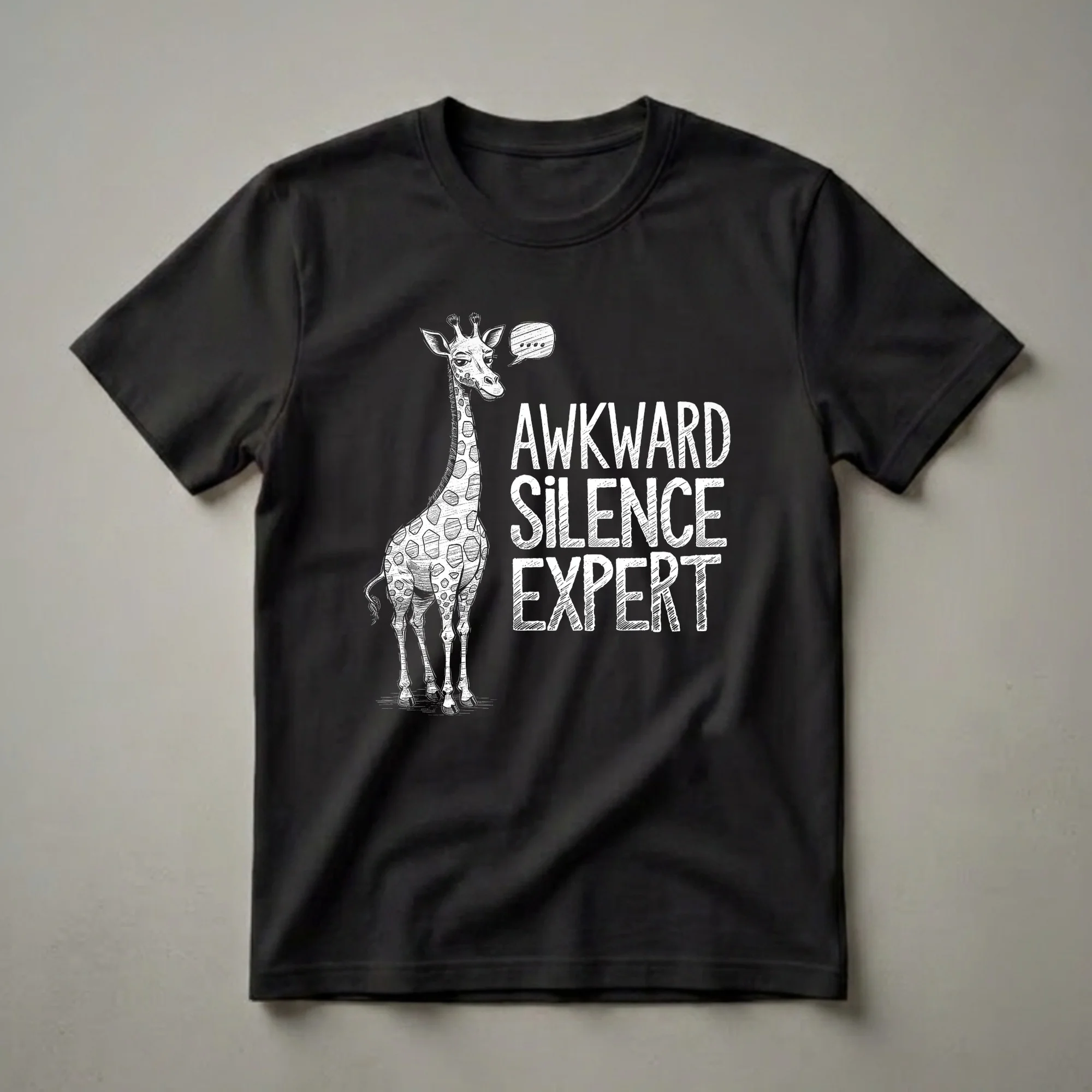 - Features a unique black and white sketch of a giraffe with "Awkward Silence Expert" text.